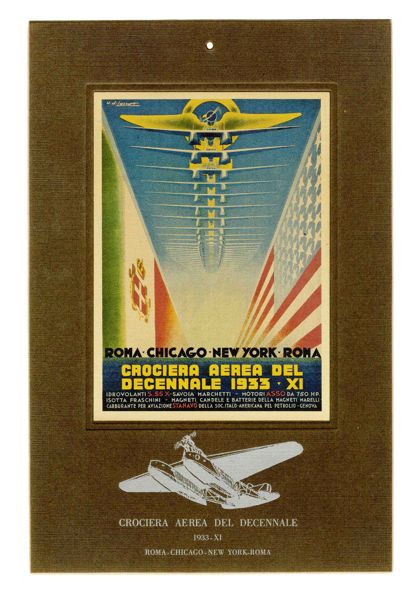 Sotto al centro titolo, "Roma-Chicago-New York-Roma" e "Idrovolanti S.55 X - Savoia Marchetti - Motori Asso da 750 HP. Isotta Fraschini - Magneti, candele e batterie della Magneti Marelli - carburante per aviazione Stanavo della Soc. italo - americana pel petrolio - Genova".