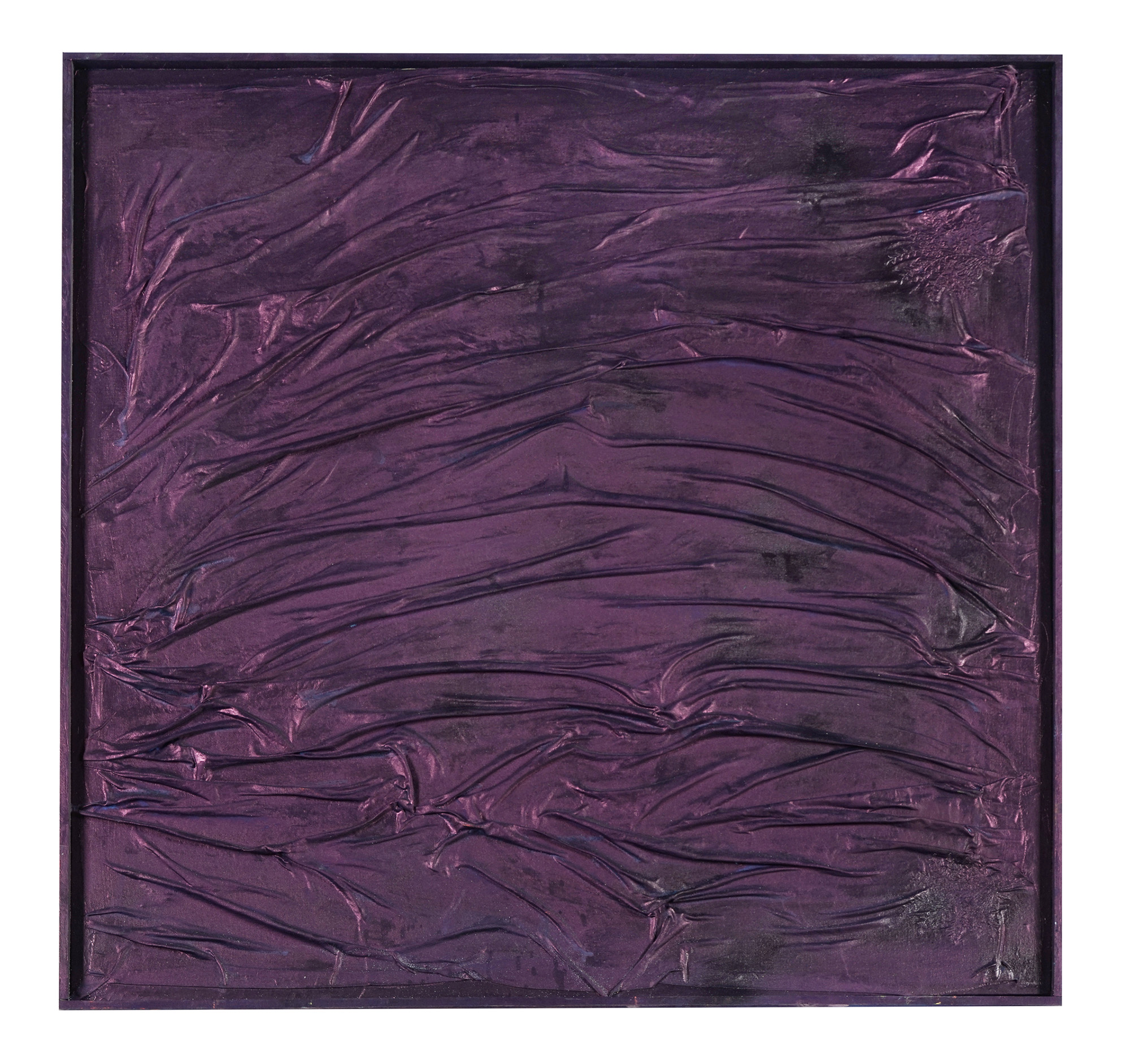 Olio blu, tessuto e vernice spray metallizzata viola su tela