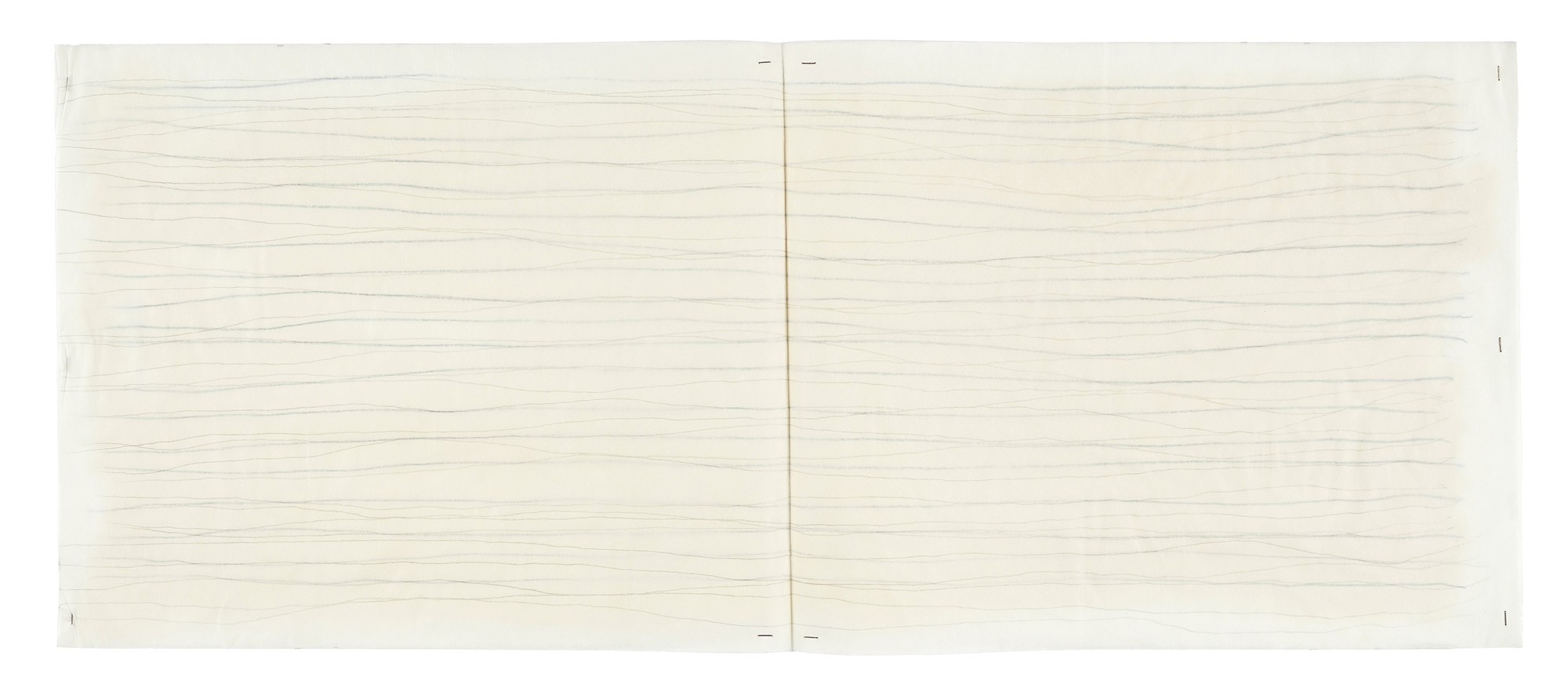 Tre fogli di carta lucidi sovrapposti e pinzati. Nel primo è presente una stesura di colore, nel secondo delle linee a pastello blu e nel terzo delle linee a matita