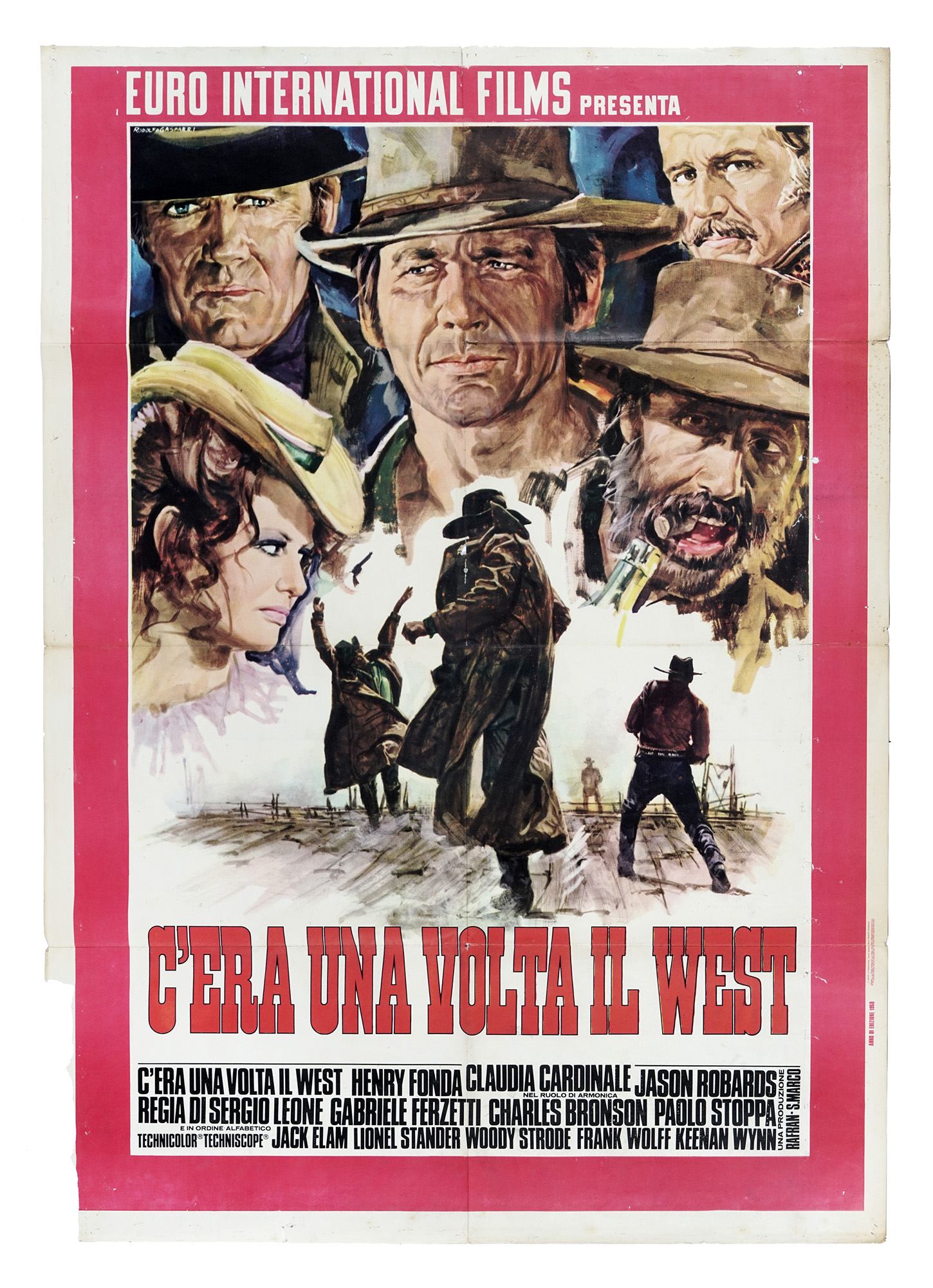 Dati editoriali ed anno di edizione lungo i margini laterali del foglio. Iconica locandina di uno dei capisaldi della cinematografia western, diretto da Sergio Leone ed interpretato da Charles Bronson, Claudia Cardinale, Henry Fonda e Jason Robards. Prodotto dalla Paramount Pictures, questa pellicola verrà nel 2009 inserita nel National Film Registry dalla Biblioteca del Congresso per la sua importanza storica e culturale.