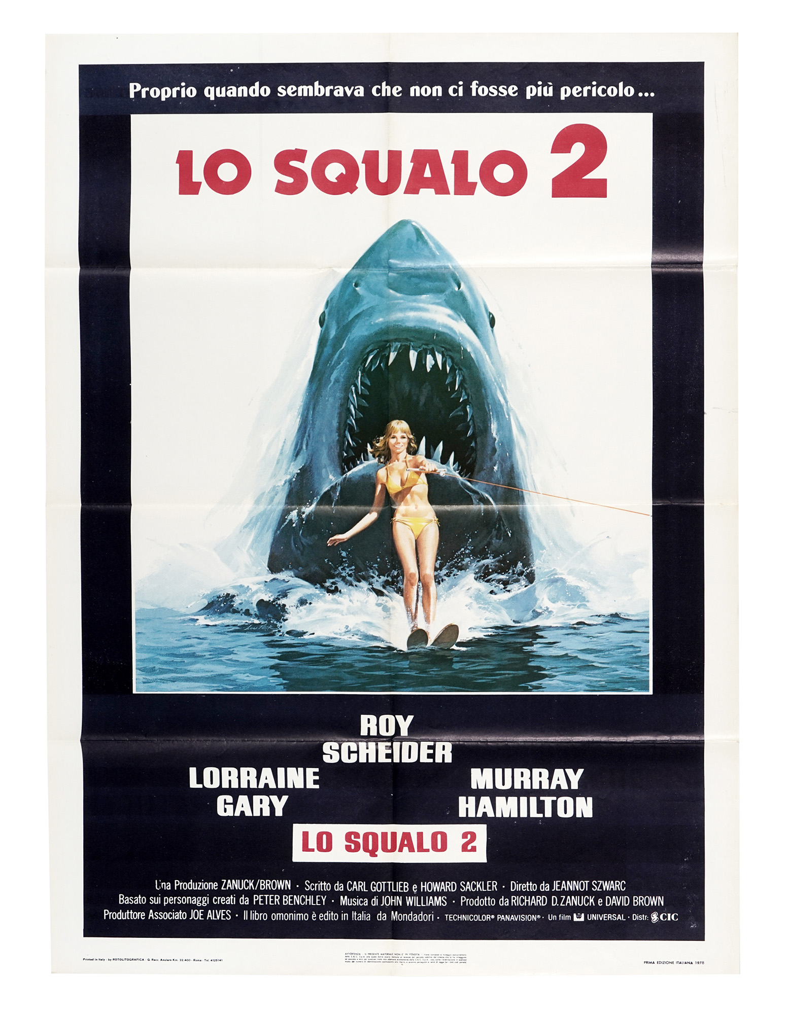 Iconico poster in prima edizione italiana del sequel di Jaws (Lo squalo), pubblicato contemporaneamente negli Stati Uniti ed in Italia nel 1978. Sotto la direzione e regia di Jeannot Szwarc, Lo squalo 2 esce lo stesso giorno di Grease (il musical di Randal Kleiser), superandolo ogni concorrenza di incassi per lo stesso anno.
