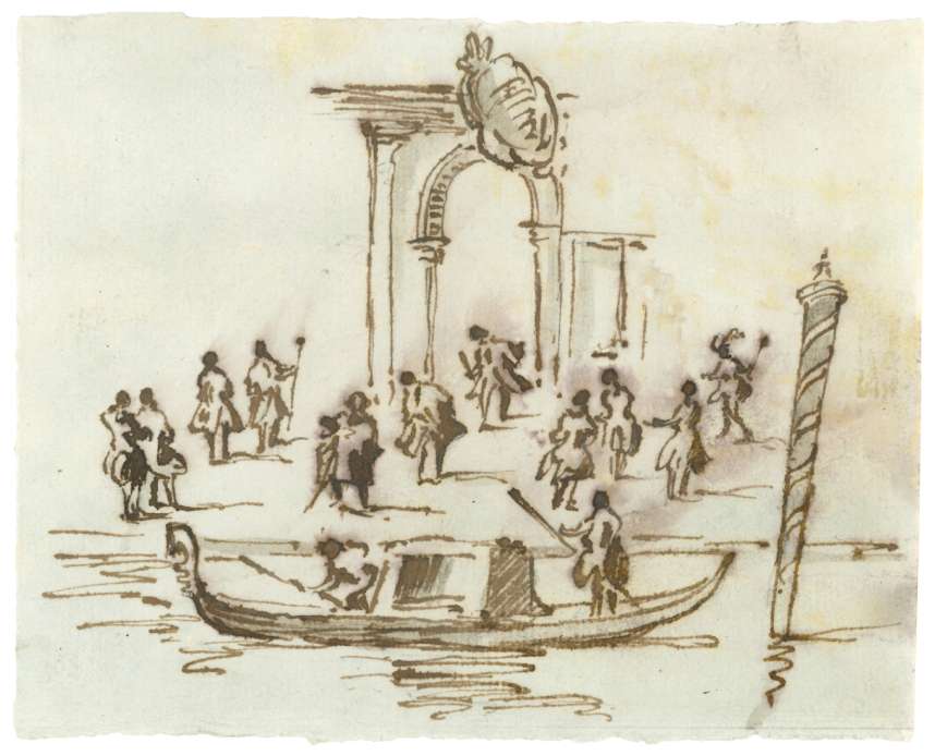 Seguace di Francesco Guardi (Venezia 1712 – 1793), Studio di figure con gondola e briccola, XVIII secolo, penna a inchiostro marrone, cm 11,5x14,5