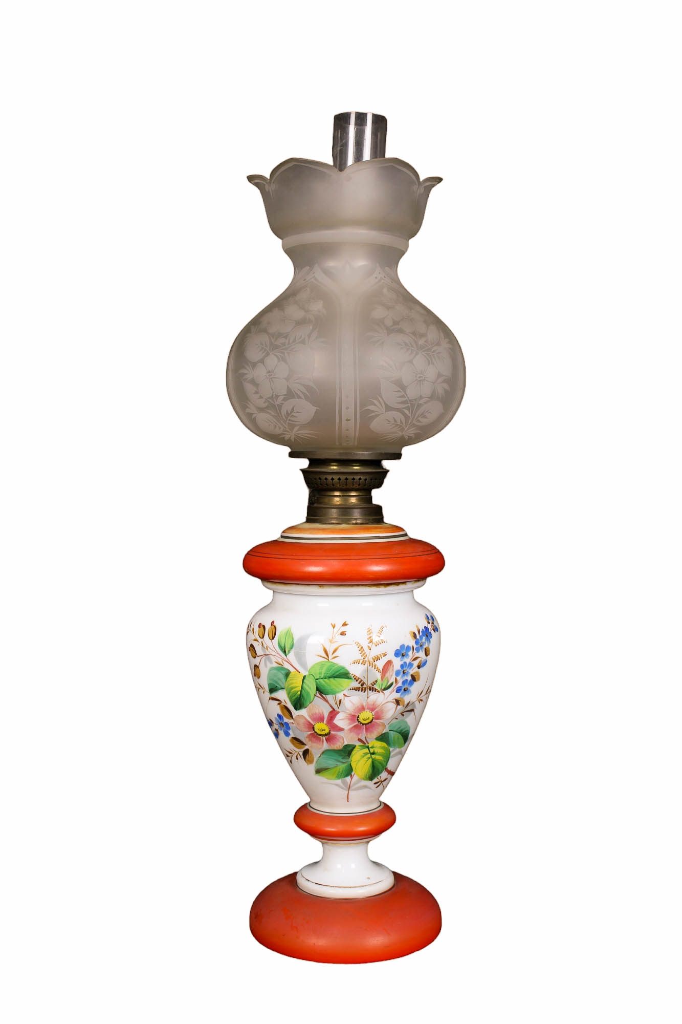 LUME in opaline con decorazione floreale e boccia in vetro satinato Sicilia fine XIX secolo h cm 63 x 15