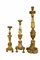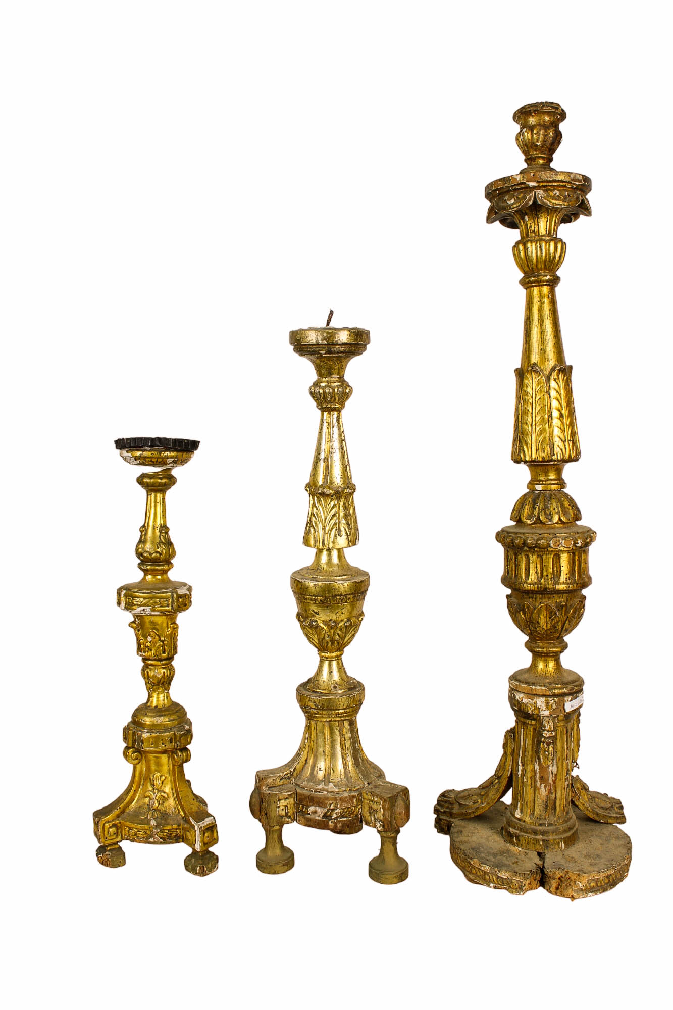 TRE TORCERI in legno scolpito e dorato ad argento e mecca Sicilia XVIII secolo h cm 87 / h cm 62 / h cm 49,5