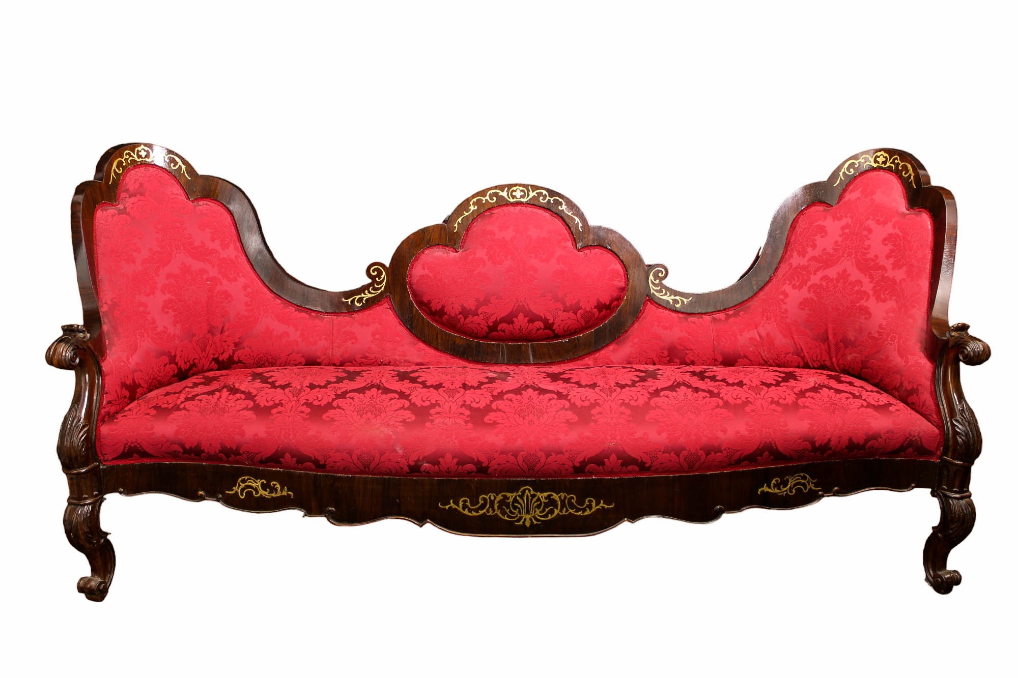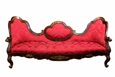 DIVANO TRE POSTI CARLO X in palissandro scolpito con decorazioni in metallo Sicilia XIX secolo h cm 104 x 225 x 75