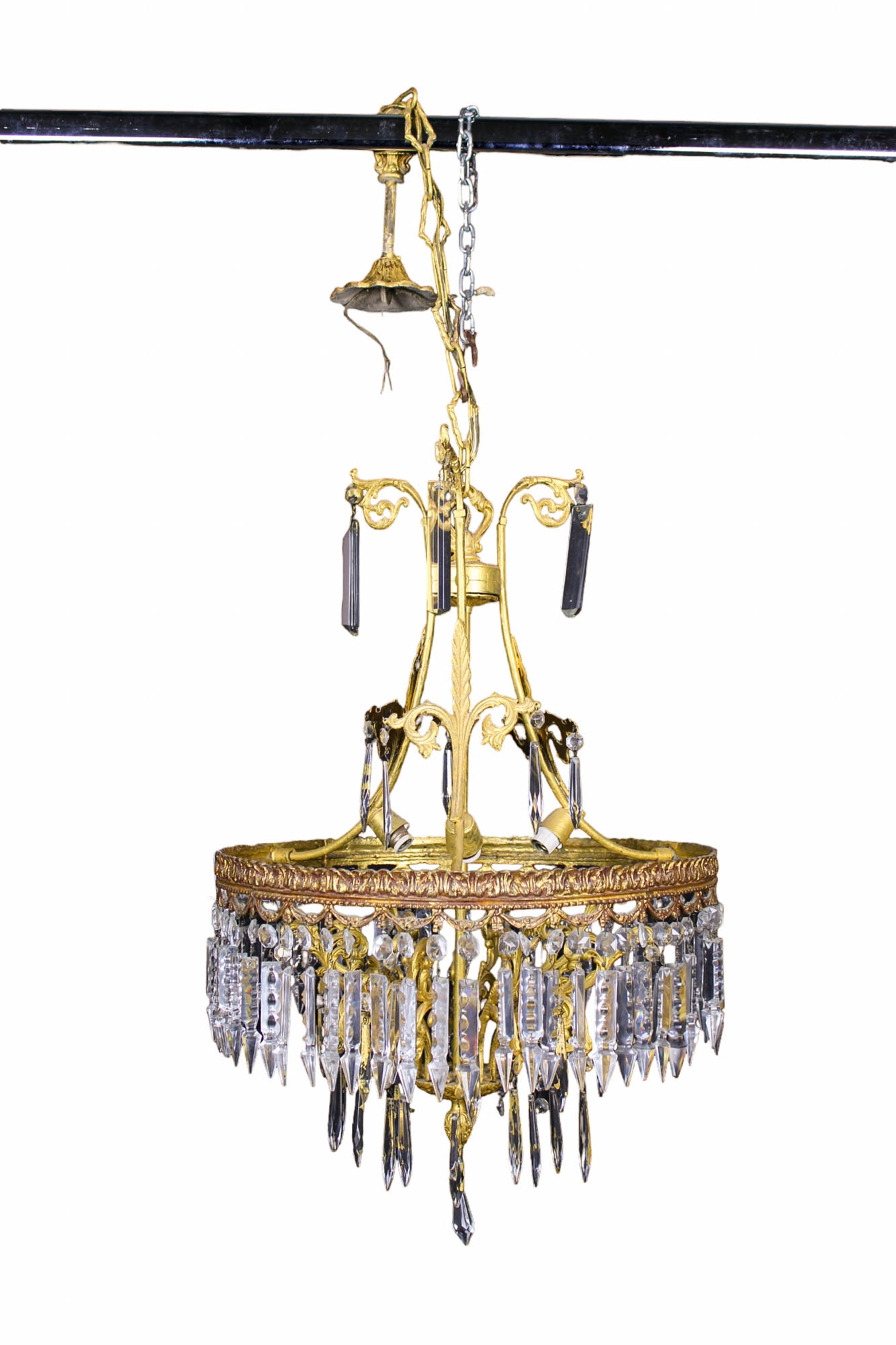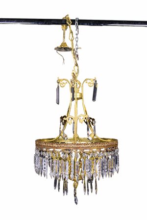 LAMPADARIO in bronzo dorato con pendenti in vetro Sicilia primi 900 h cm 110 x 43