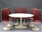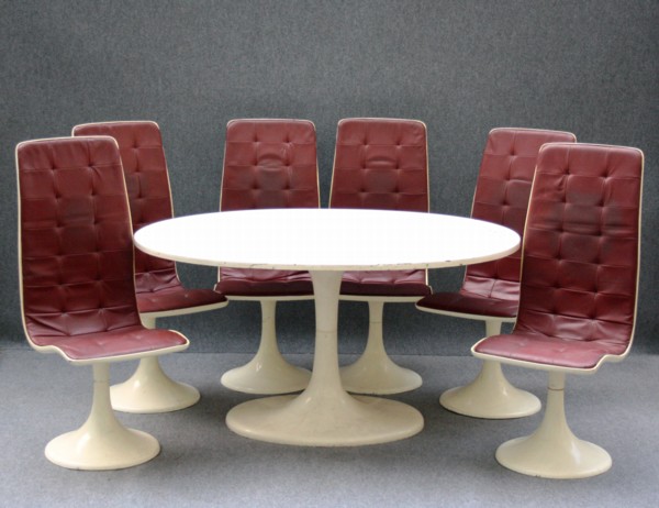 Tavolo con sei sedie in resina poliestere rinforzata, sedie a schienale alto con imbottitura in similpelle bordeaux. Tipo KNOLL. Anni '60-'70. Difetti. Mis. tavolo Alt. cm 73, Largh. cm 140, Prof. cm 100; mis. sedie Alt. cm 107, Largh. cm 43, Prof. cm 46.