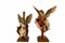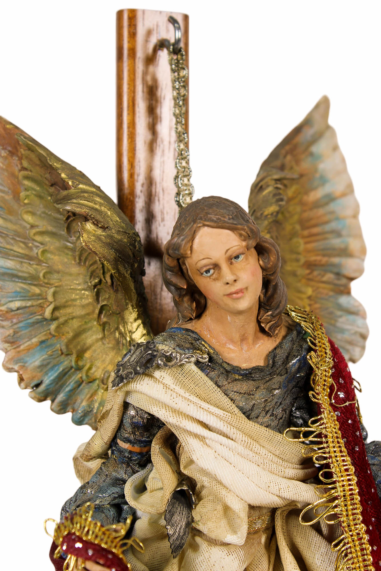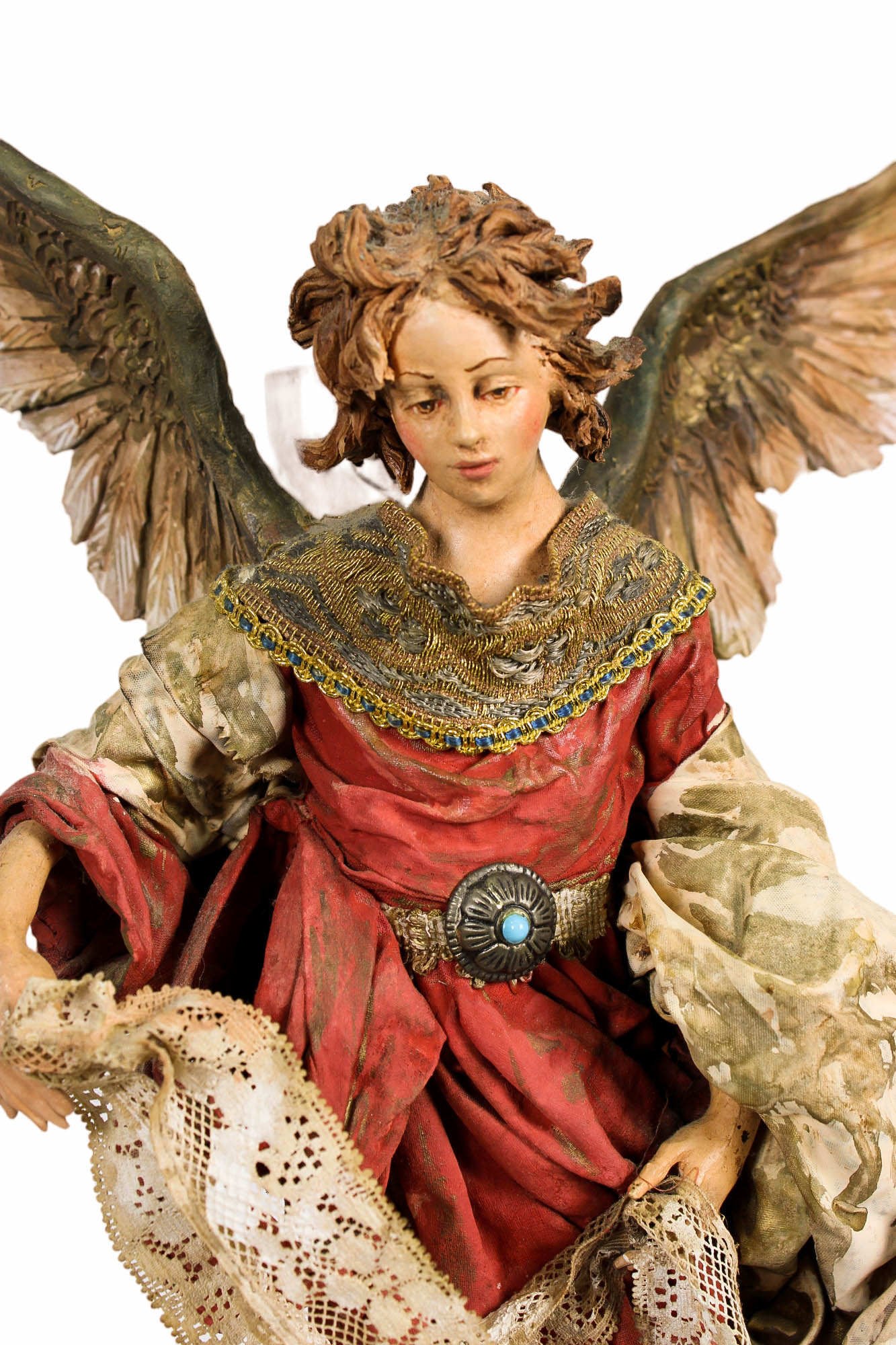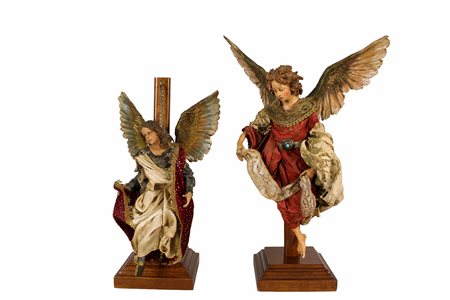 COPPIA DI ANGELI in terracotta e cartapesta policroma soretti da supporto in legno manifattura italiana XX secolo h cm 42 x 27,5 / h cm 32,5 x 18