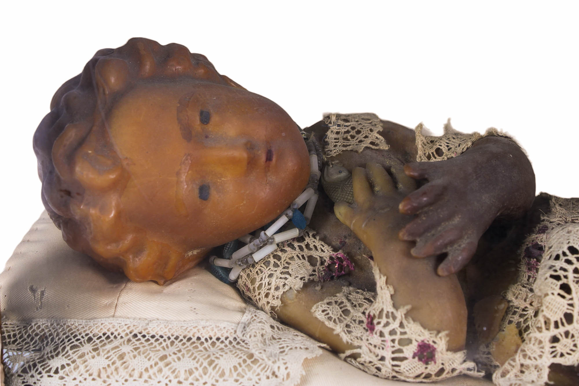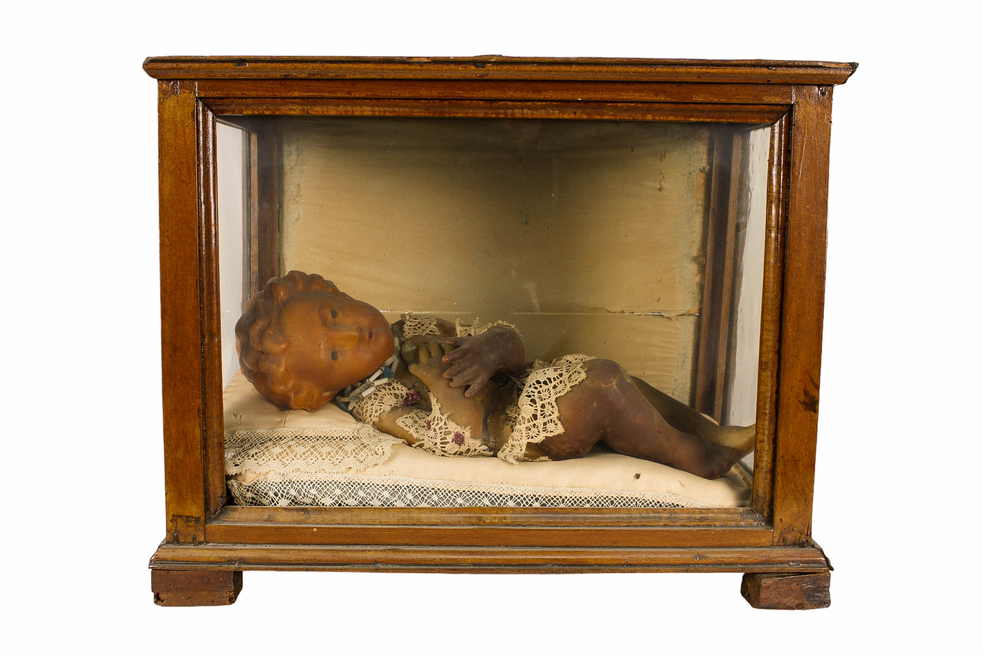 TECA contenente bambinello in cera Sicilia XIX secolo h cm 36 x 13 / teca h cm 32,5 x 41,5 x 23