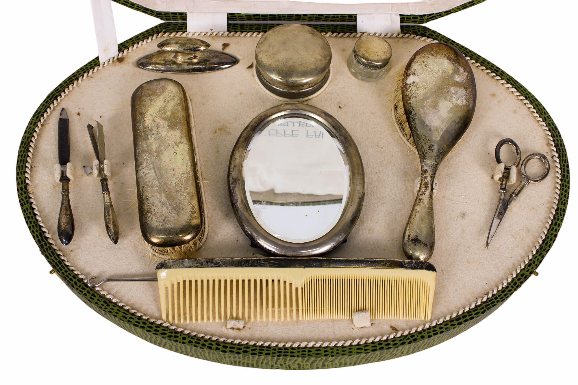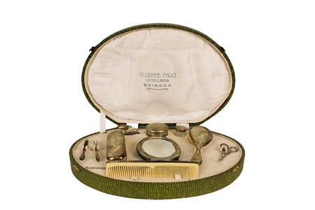 SERVIZIO DA TOLETTA laminato in argento 800 composto da undici pezzi dentro custodia manifattura siciliana primi 900 misure varie