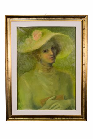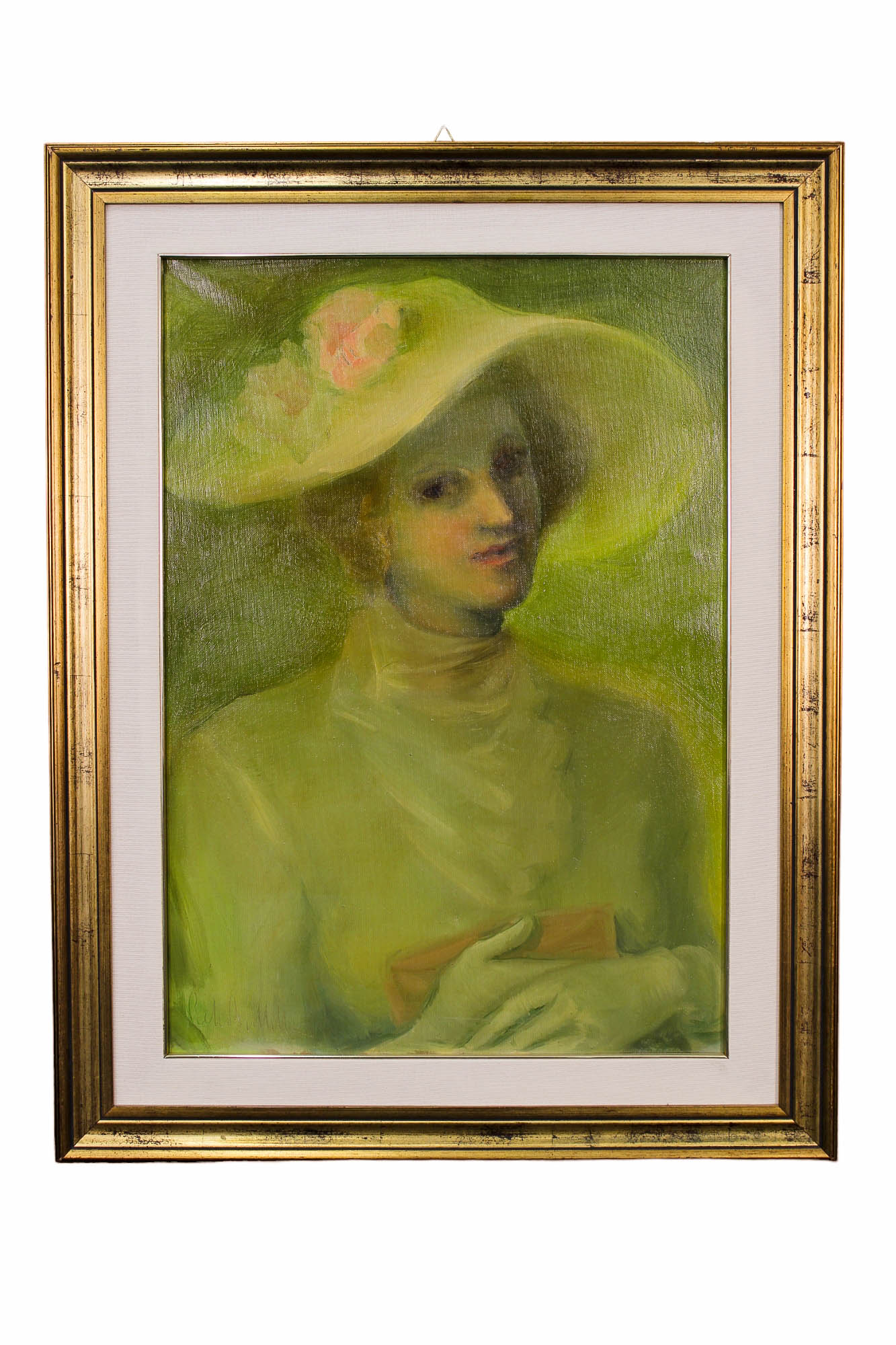 OLIO SU TELA raffigurante donna con cappello dentro cornice in legno a firma Pietro Buttitta datato sul retro Palermo 26-02-1982 h cm 70 x 50 / cornice h cm 89 x 68,5