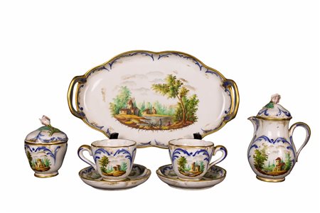 SERVIZIO TETE A TETE in porcellana dipinta raffigurante paesaggi con lumeggiature in oro manifattura Capodimonte primi 900 misure varie
