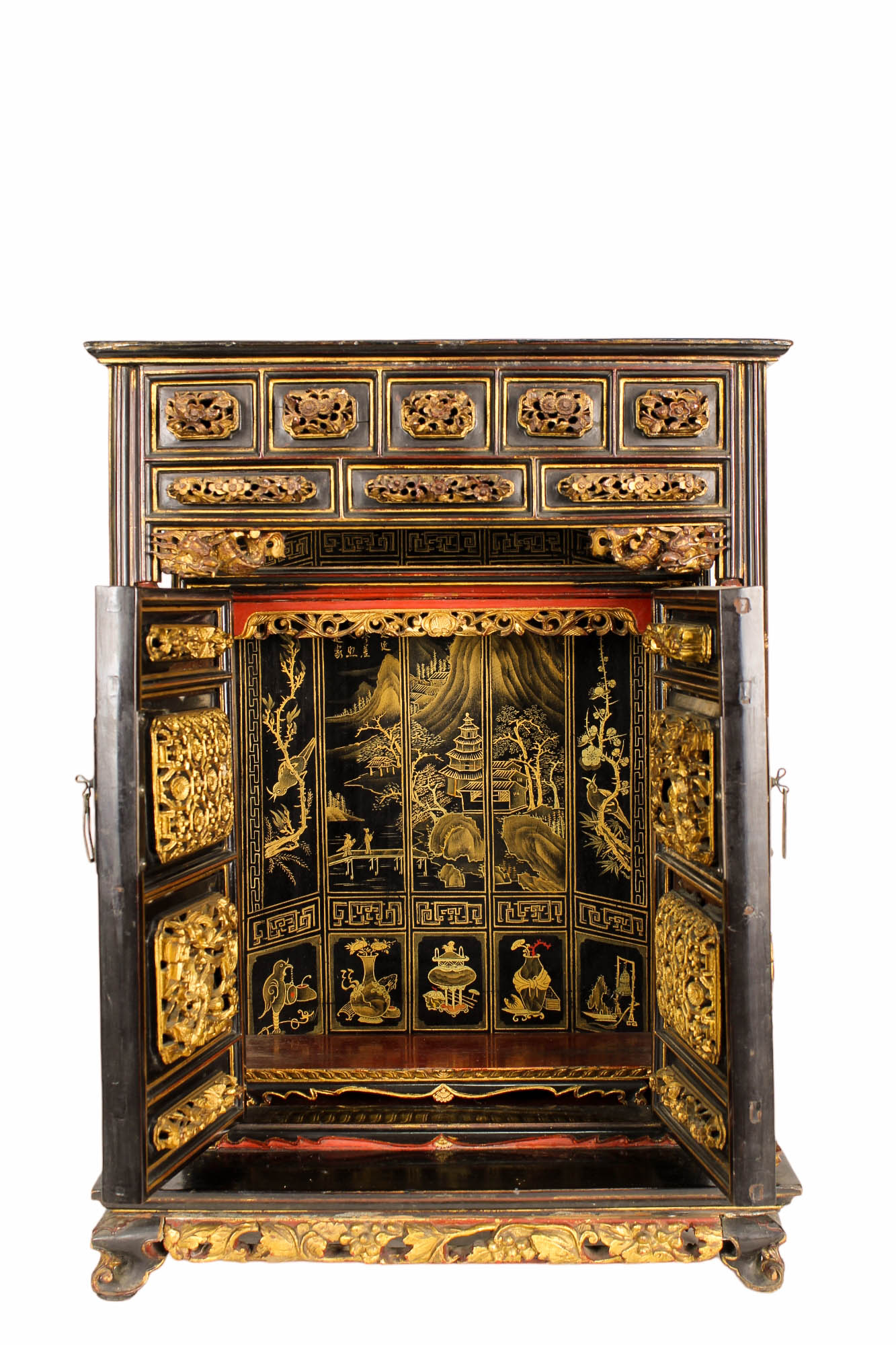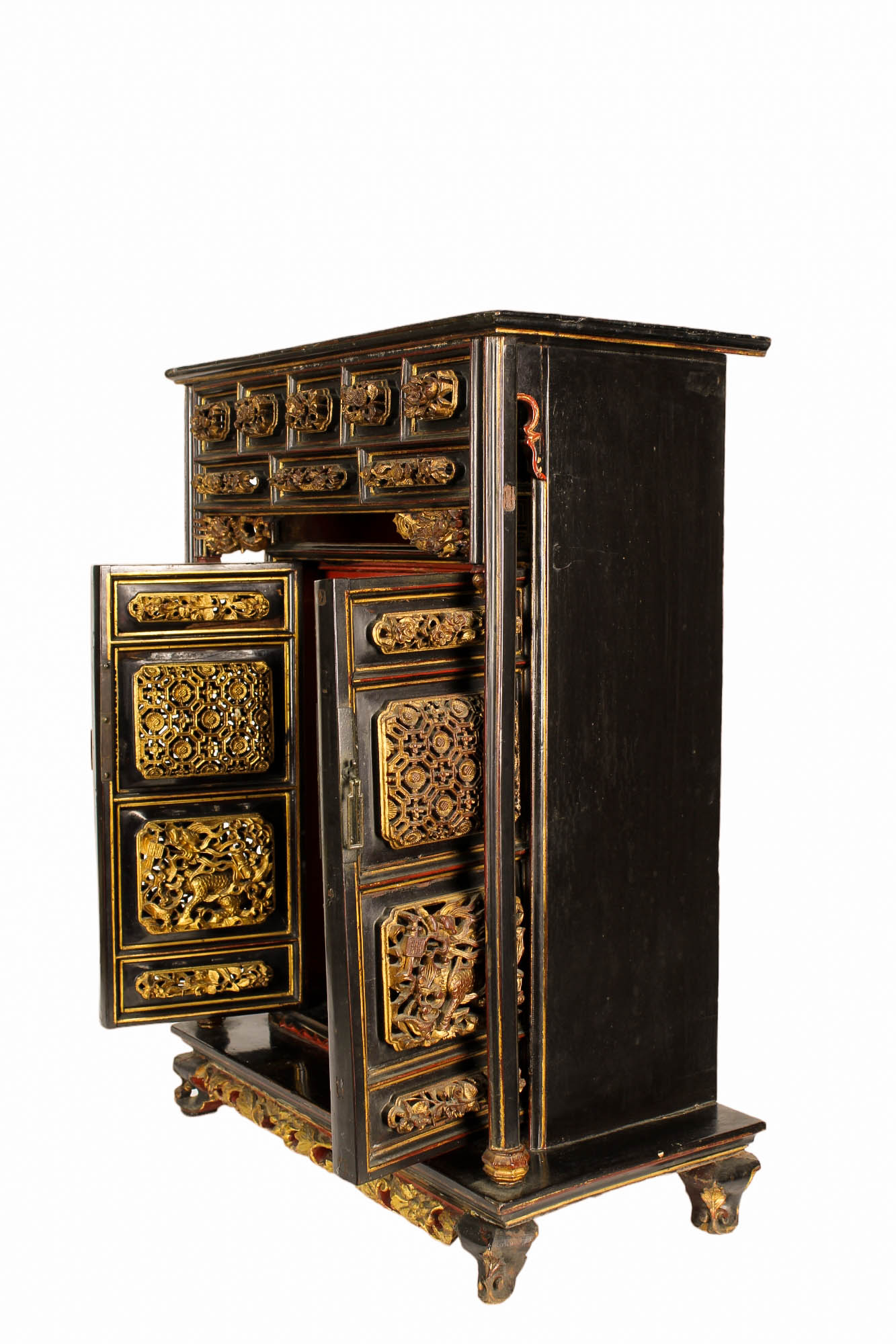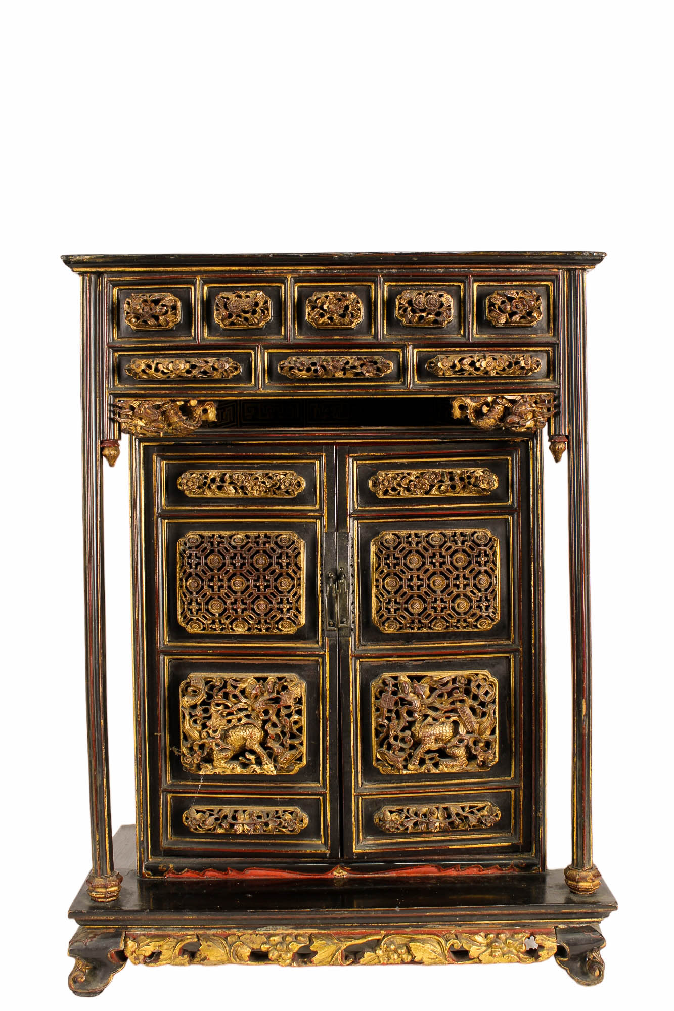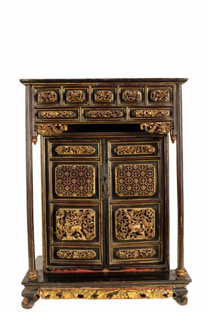 MINIATURA DI MOBILE in legno riccamente scolpito dorato e laccato a chinoiserie manifattura orientale XIX secolo h cm 51,5 x 38,5 x 19,5