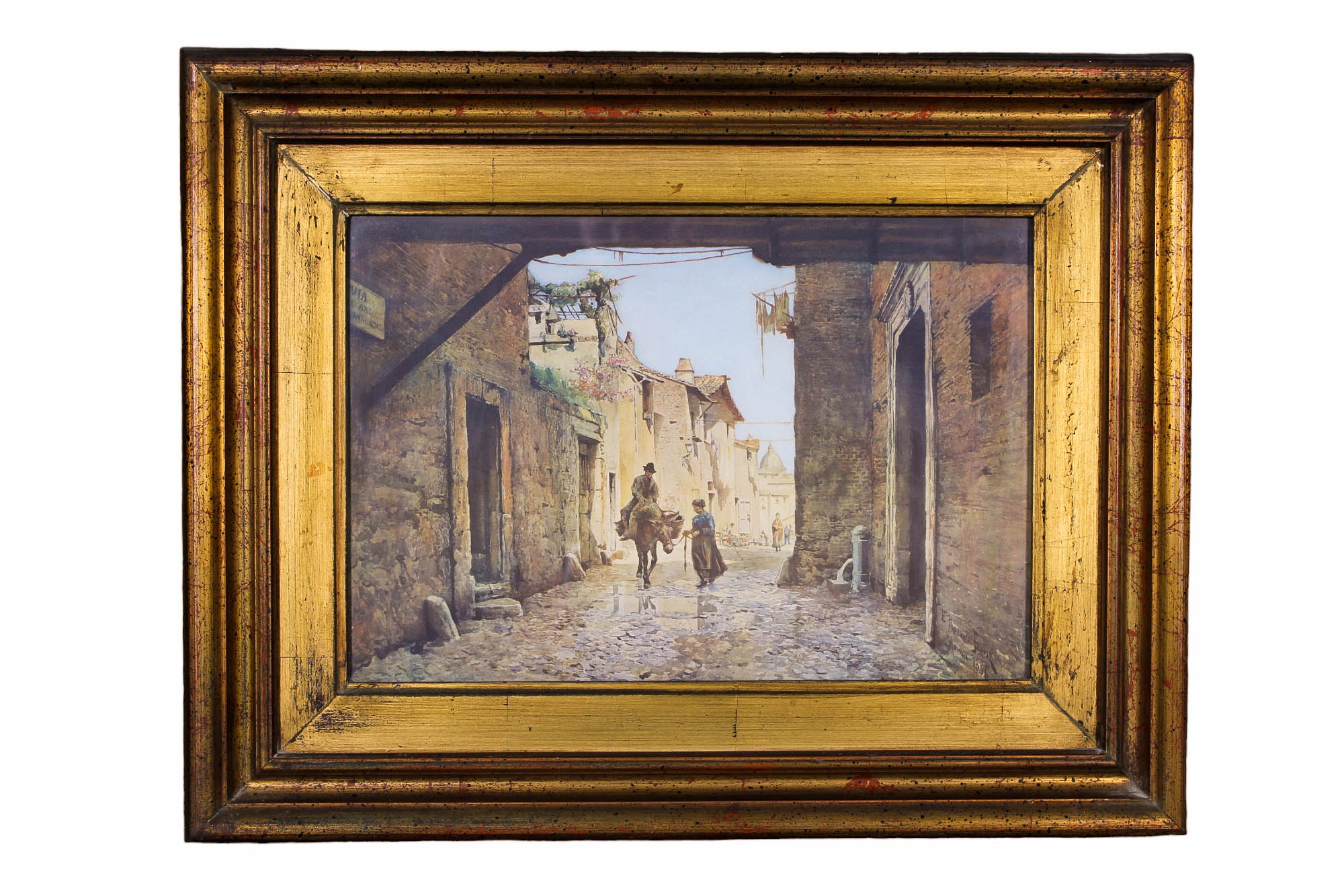 DIPINTO SU COMPENSATO raffigurante scorcio di paese con personaggi firma illeggibile primi 900 h cm 43 x 55