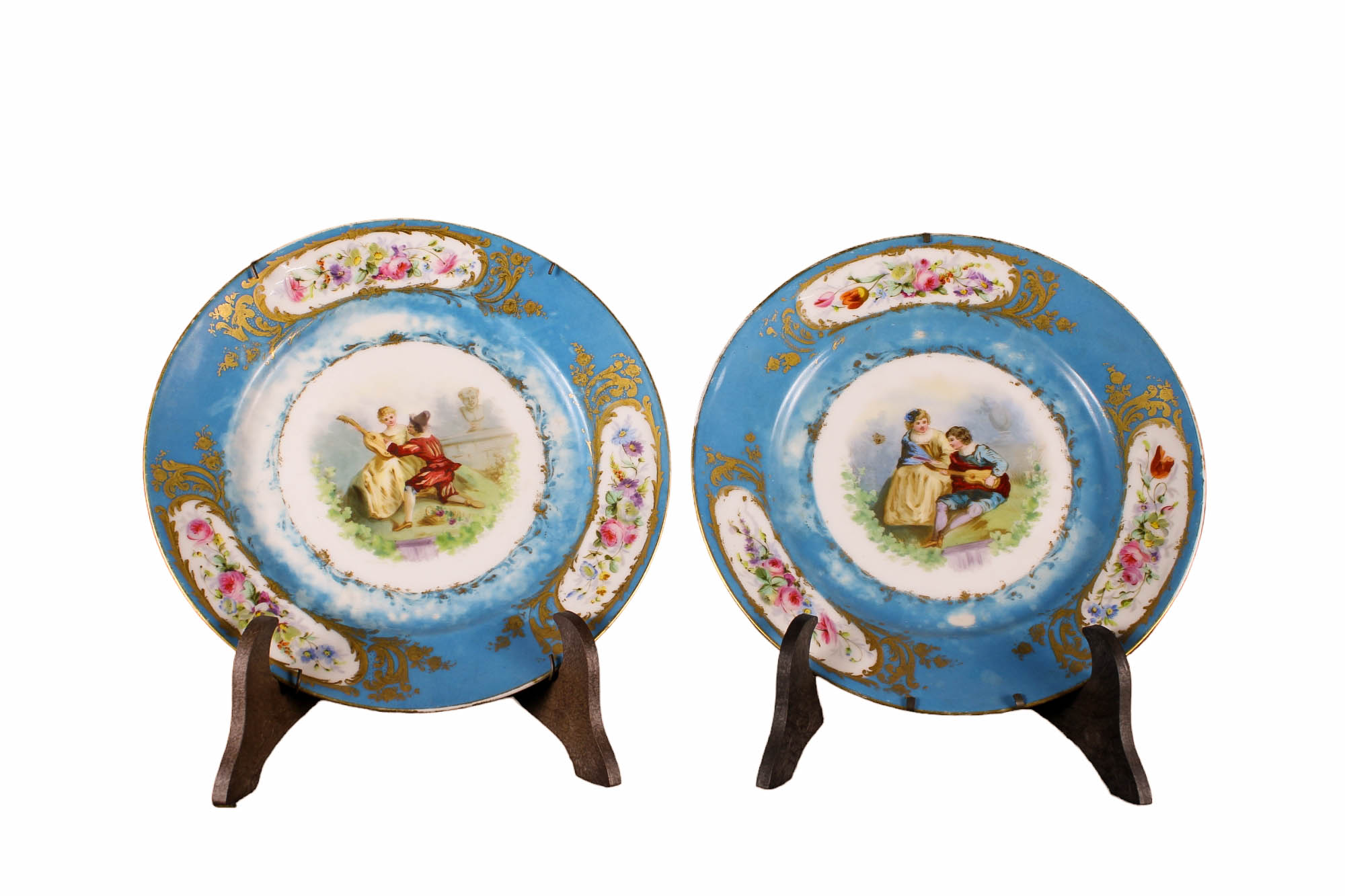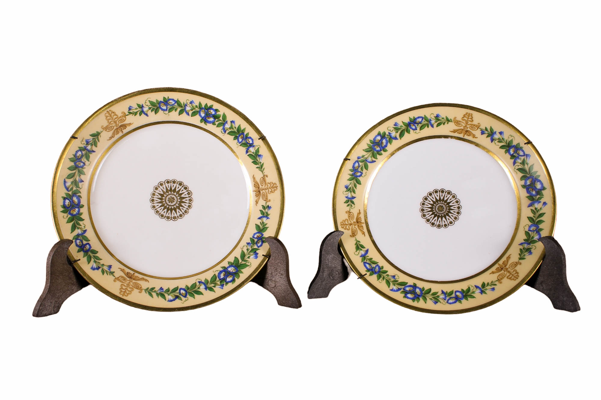 QUATTRO PIATTI in porcellana dipinta e lumeggiature in oro manifattura francese XIX secolo Ø 22