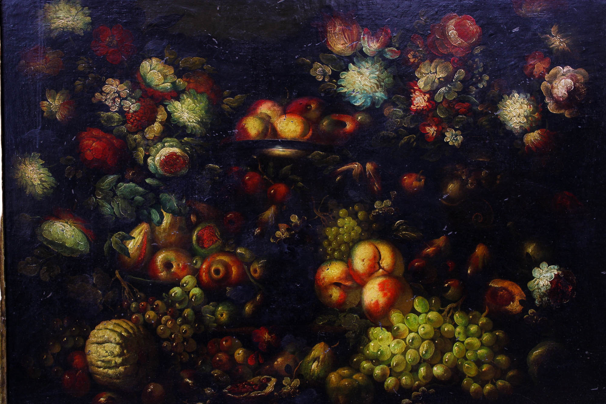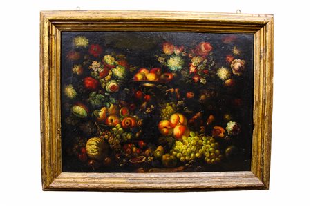 PREGIATO DIPINTO OLIO SU TELA raffigurante natura morta con fiori e frutti cornice in legno dorato coeva scuola siciliana XVIII/XIX secolo h cm 73 x 99 / cornice h cm 94 x 121