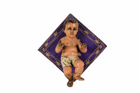 LOTTO COMPOSTO DA 1 scultura lignea finemente scolpita e dipinta raffigurante bambinello con occhi in vetro Sicilia e 1 copri calice in stoffa viola ricami dorati, usure XIX secolo h cm 31 x 14,5 / h cm 24 x 24
