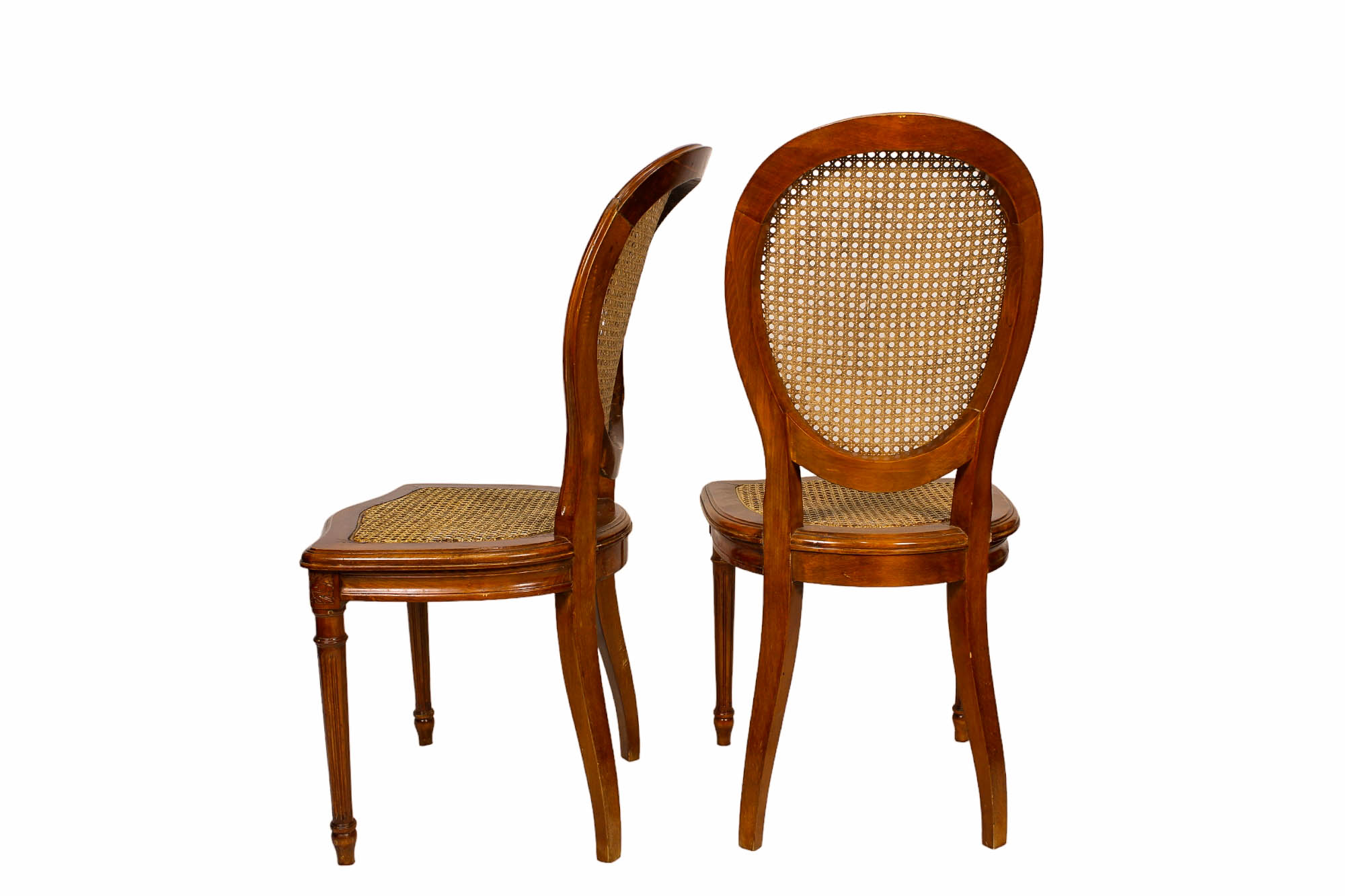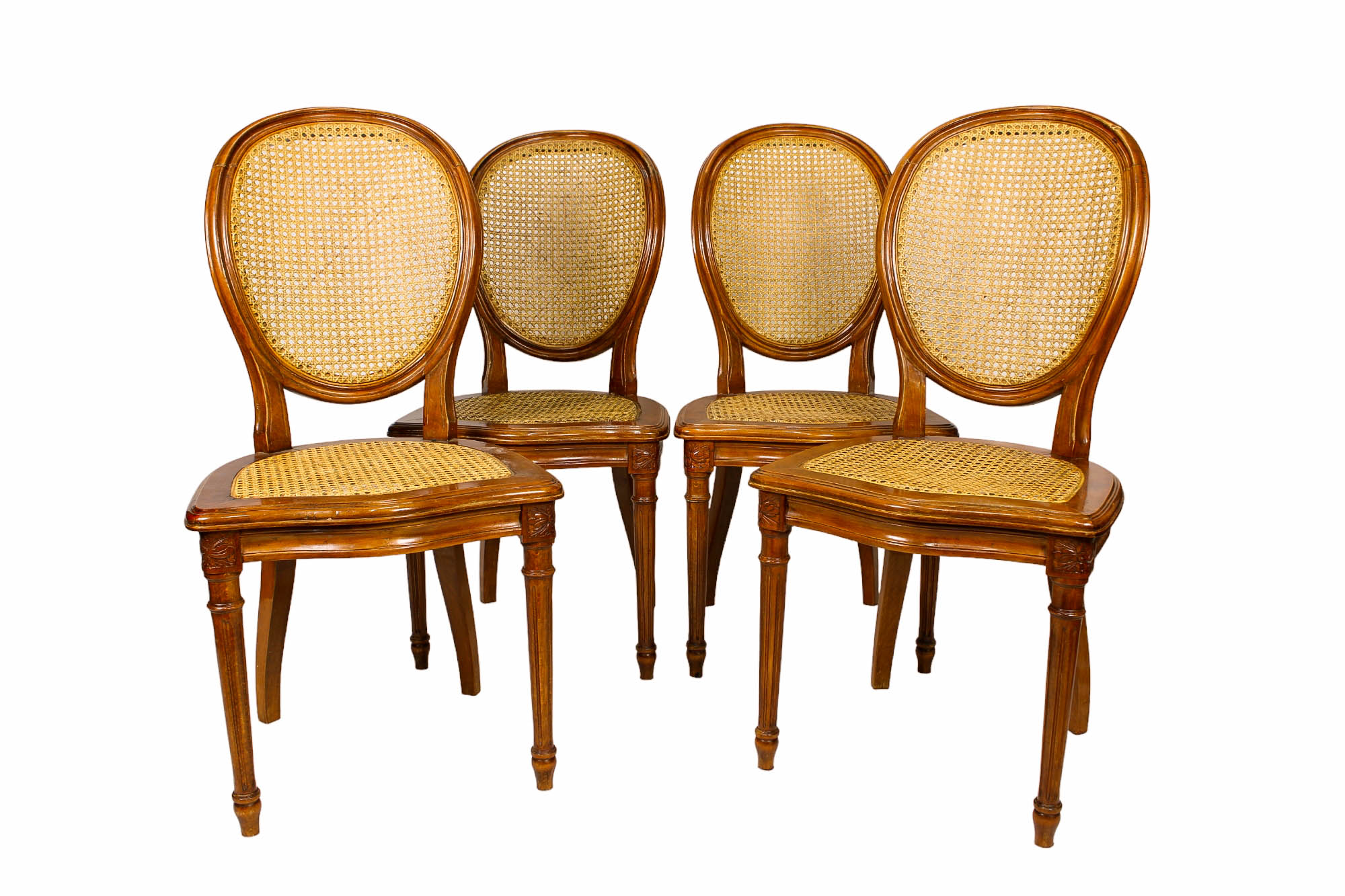 LOTTO COMPOSTO DA quattro sedie in legno di noce con seduta e schienale in vimini Francia XX secolo h cm 96 x 48 x 44