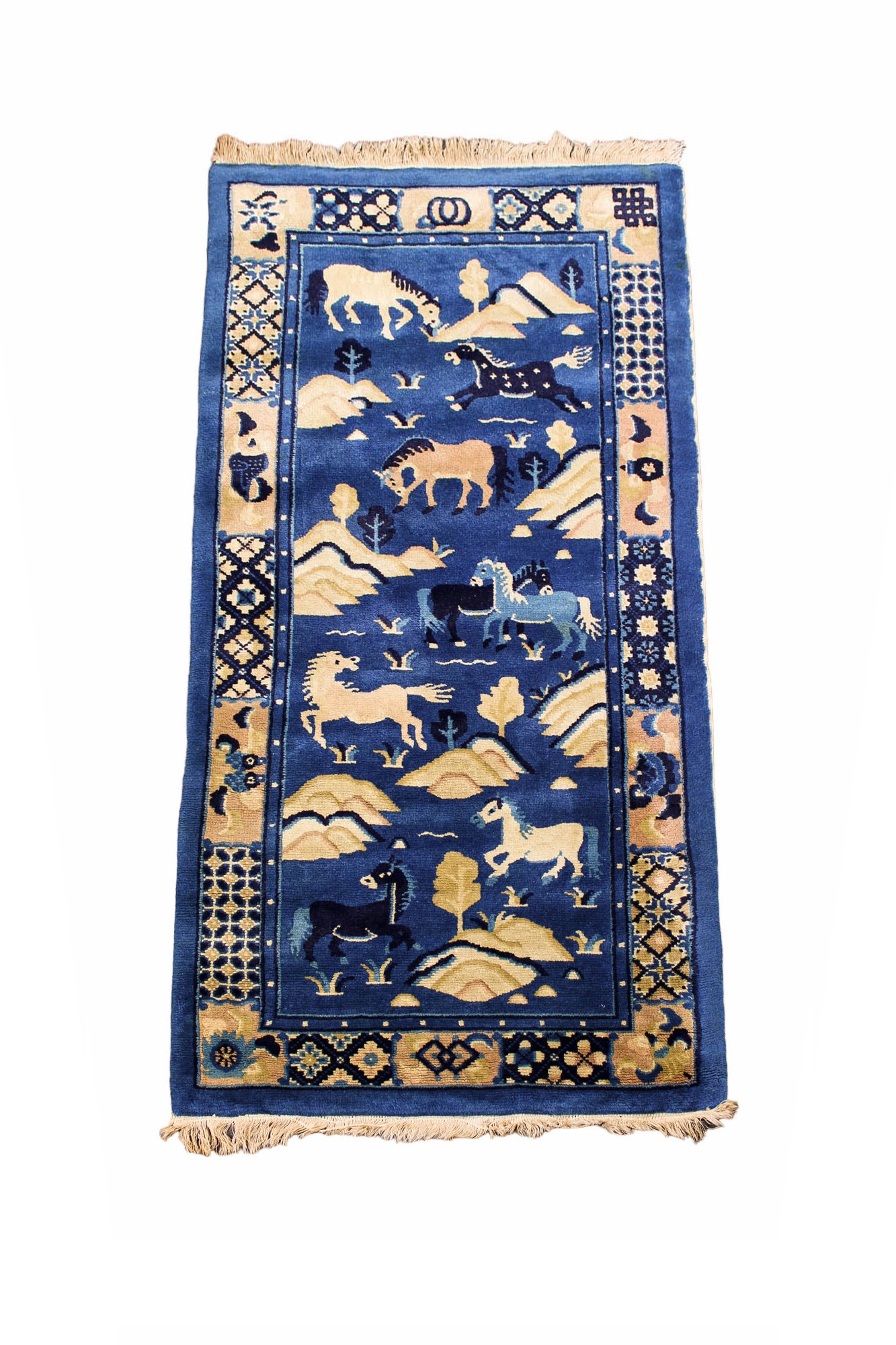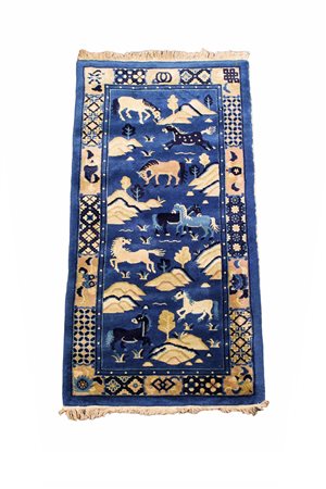 TAPPETO a fondo blu con decorazioni di cavalli e paesaggio manifattura Pechino XX secolo cm 148 x 60