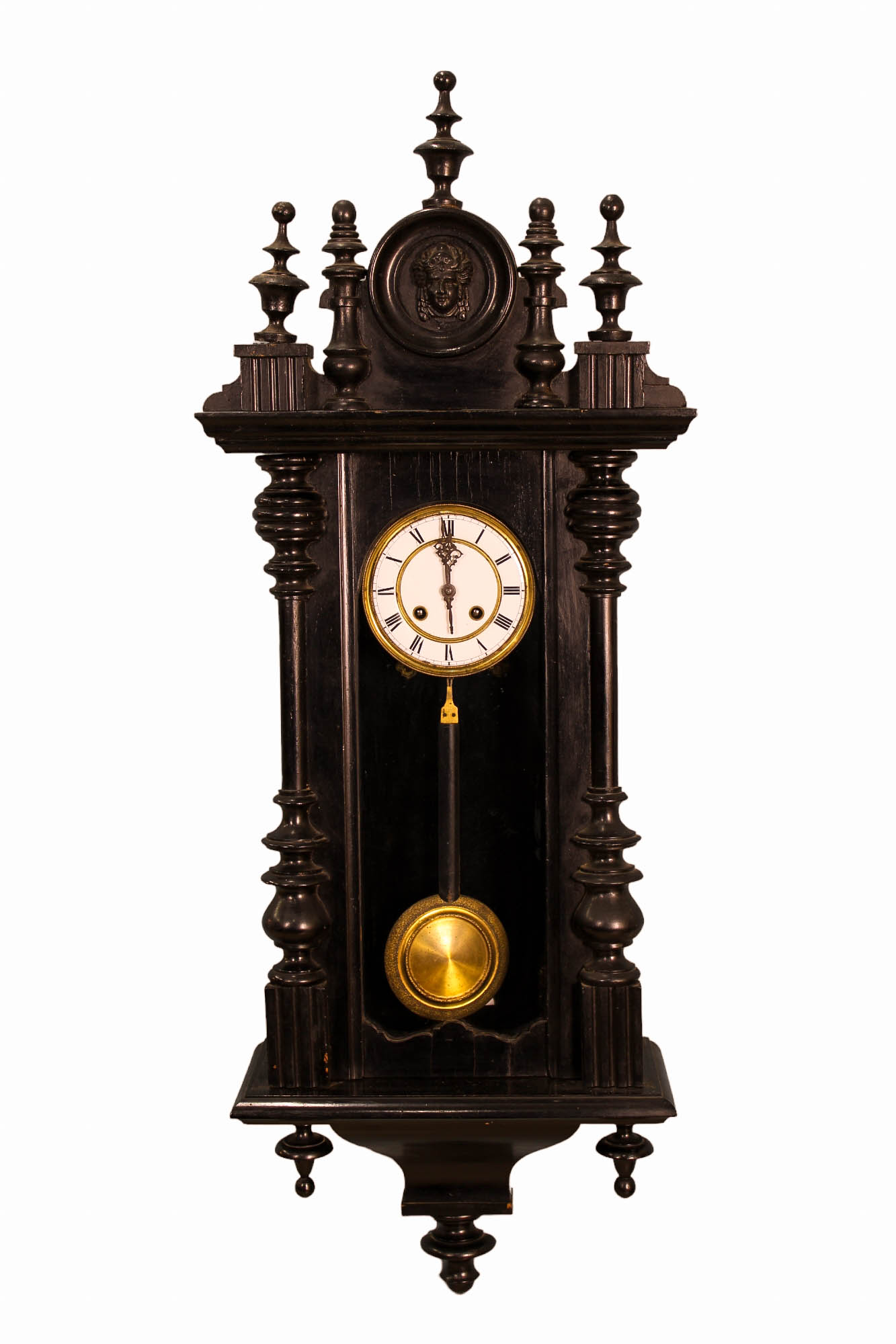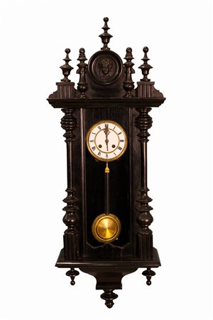 OROLOGIO DA PARETE in legno ebanizzato con pendolo quadrante in ceramica con numeri romani Sicilia primi 900 h cm 110 x 37 x 17,5