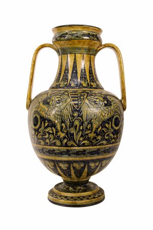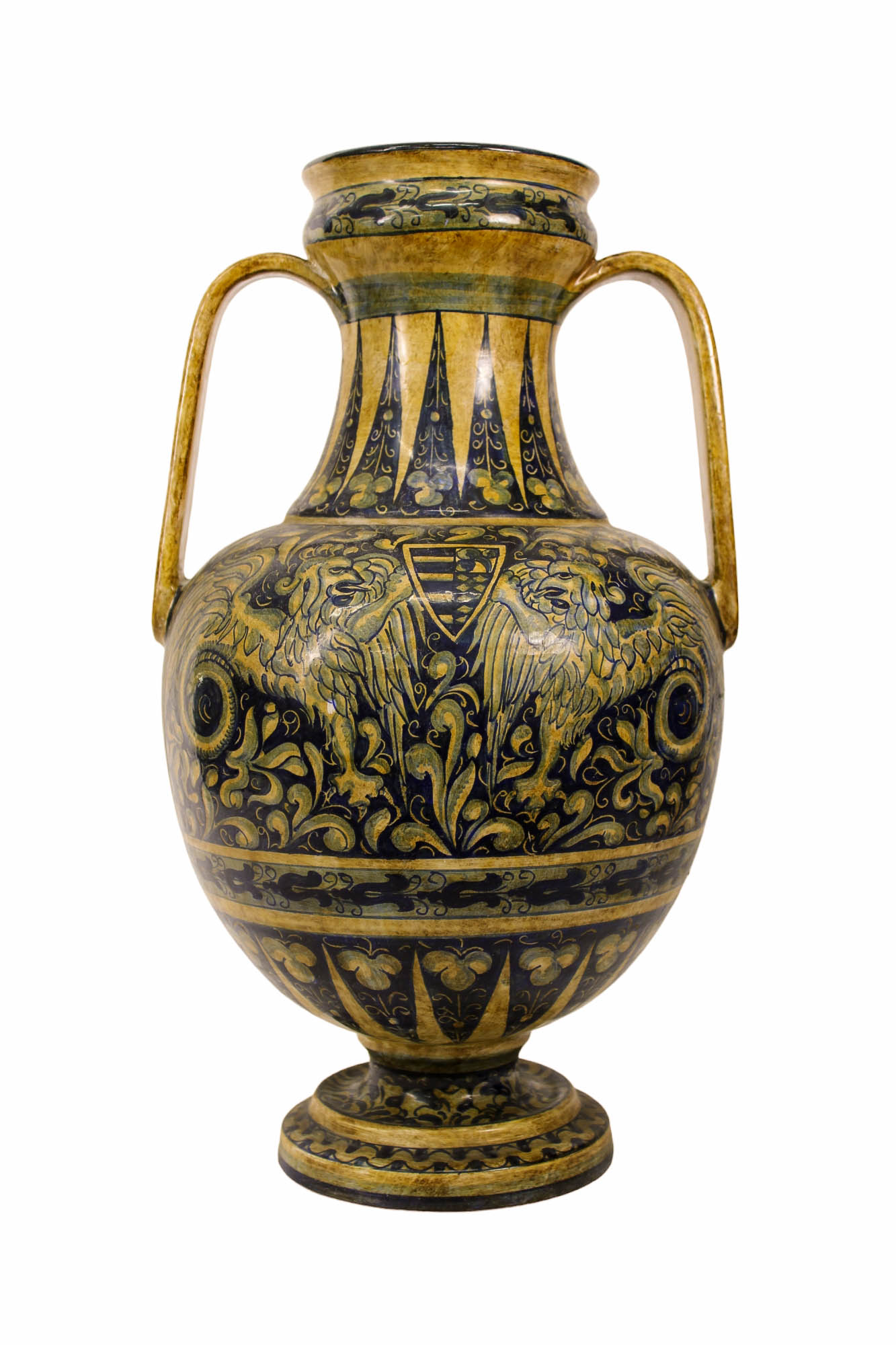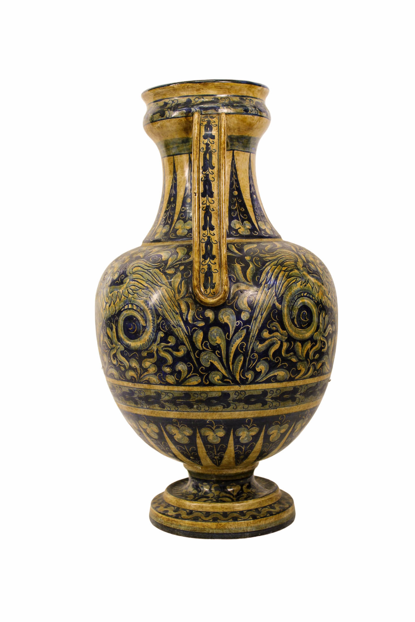 ORCIO in maiolica istoriato a fondo blu raffigurante animali fantastici manifattura Biagioli Gubbio XX secolo h cm 47 x 26