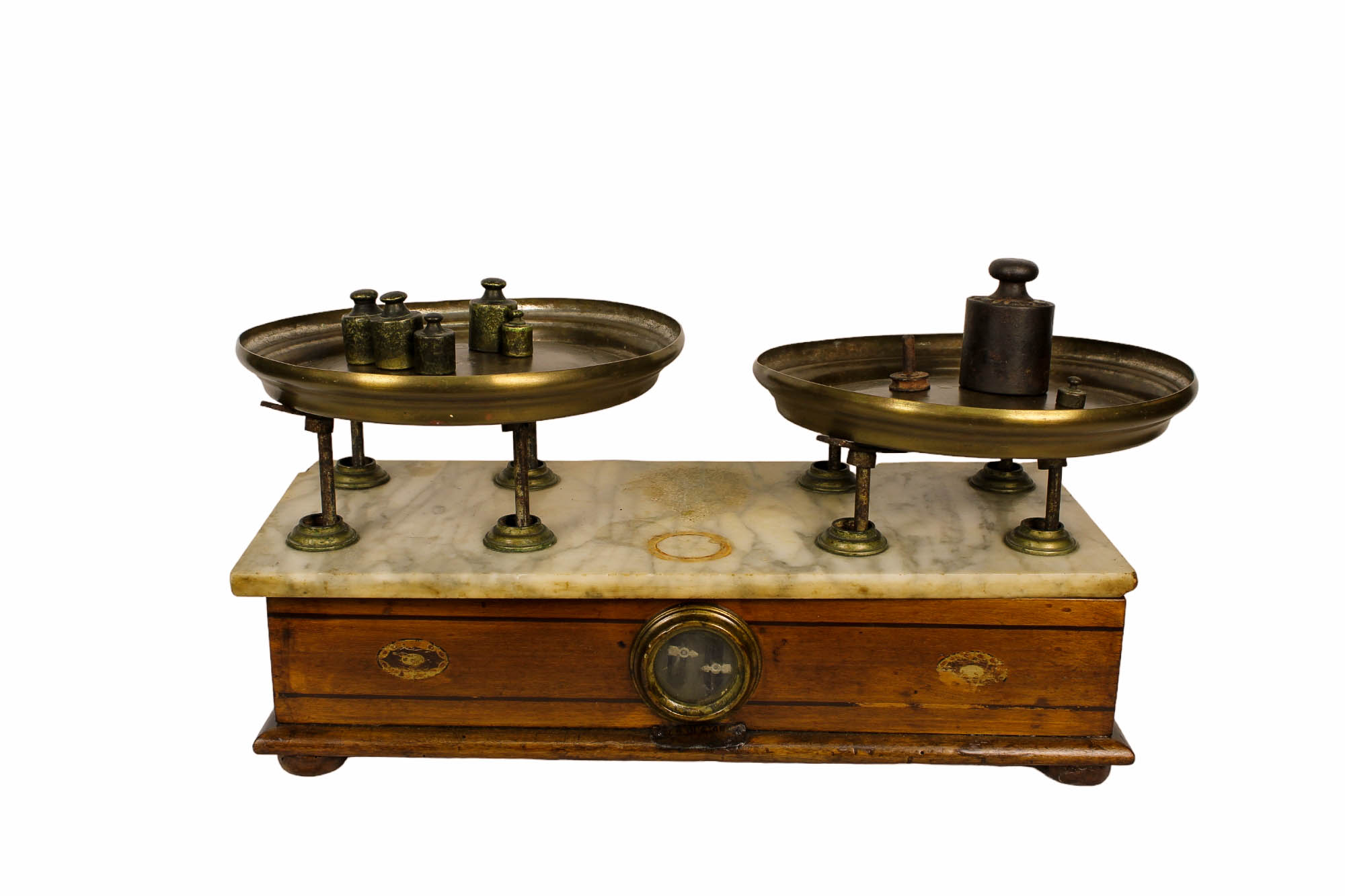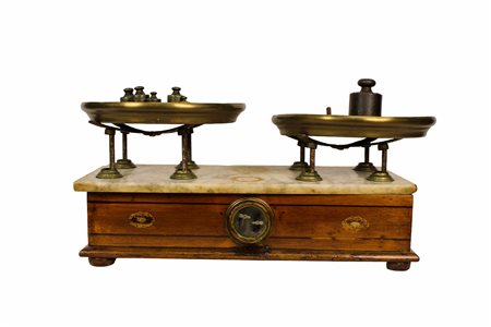 BILANCIA in legno marmo e ottone con pesi Sicilia XIX secolo h cm 25 x 52 x 22