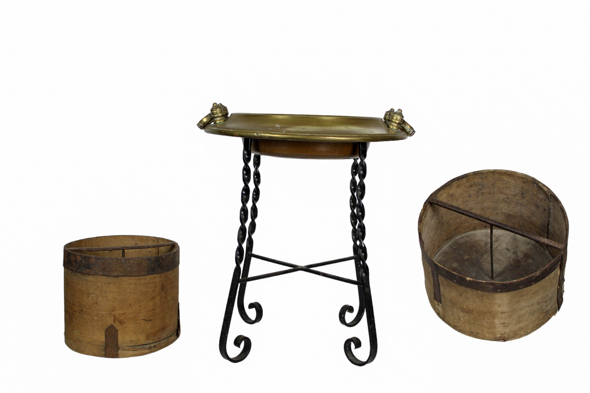 LOTTO COMPOSTO DA 1 braciere in ottone con piedistallo in ferro e 2 attrezzi per la pesa del grano detti "tummolo e mezzo tummolo" misure varie