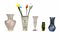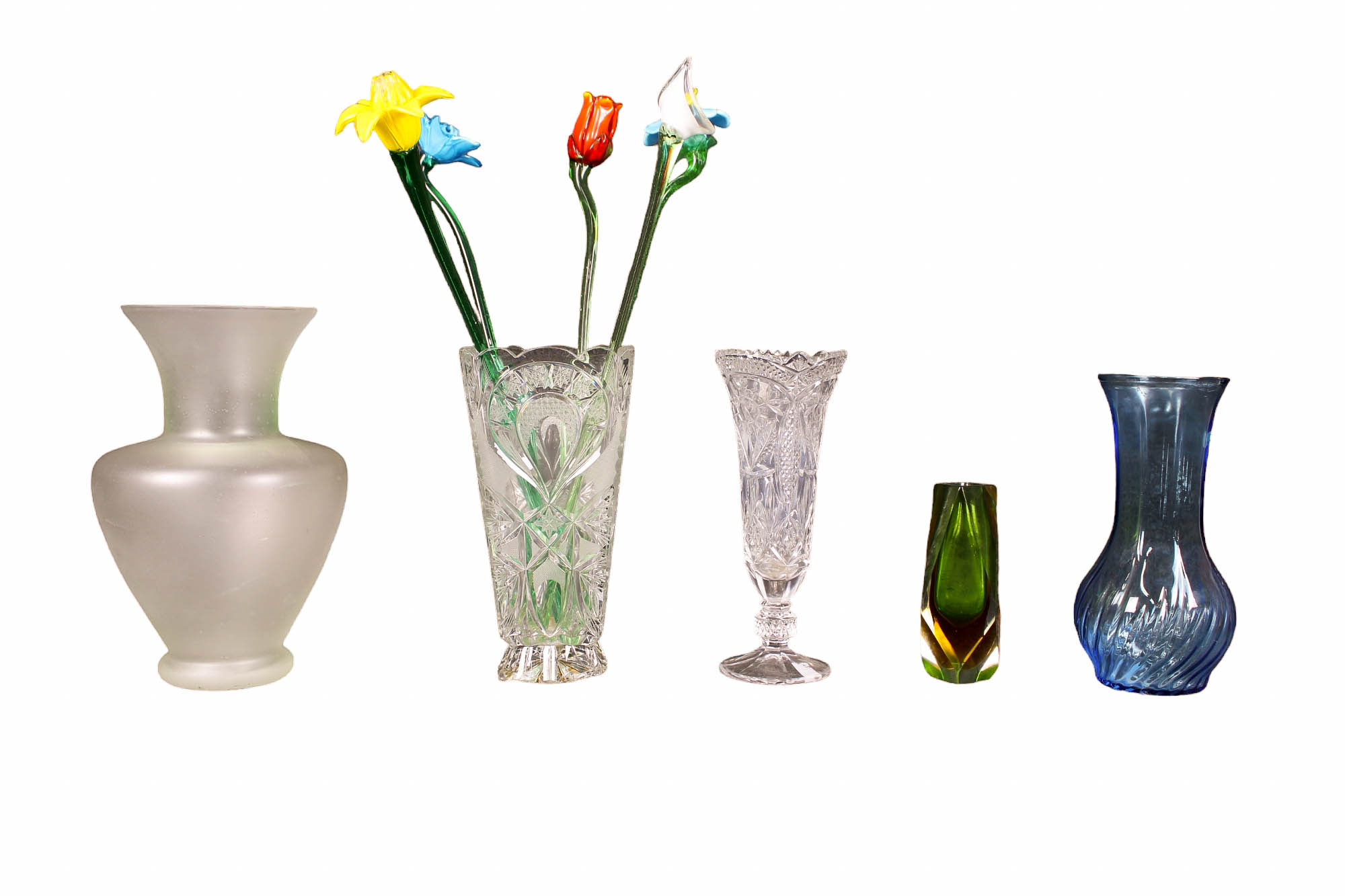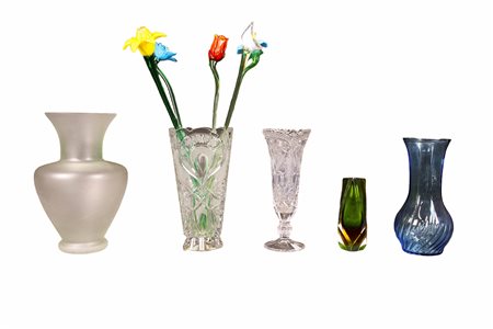 LOTTO COMPOSTO DA 5 vasi in vetro e 5 fiori in vetro di Murano maestranze italiane XX secolo misure varie