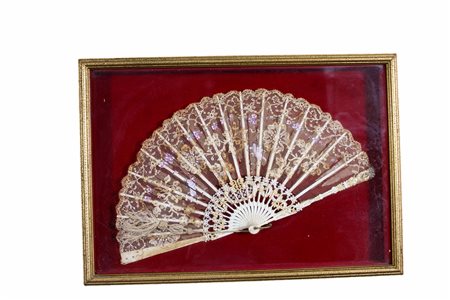 LOTTO COMPOSTO DA 2 VENTAGLI dentro teca di cui 1 in seta ricamato e 1 in pizzo, usure del tempo Francia XIX secolo h cm 35 x 50 / h cm 34 x 44
