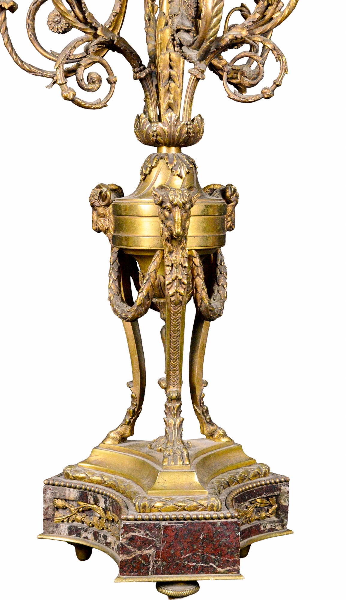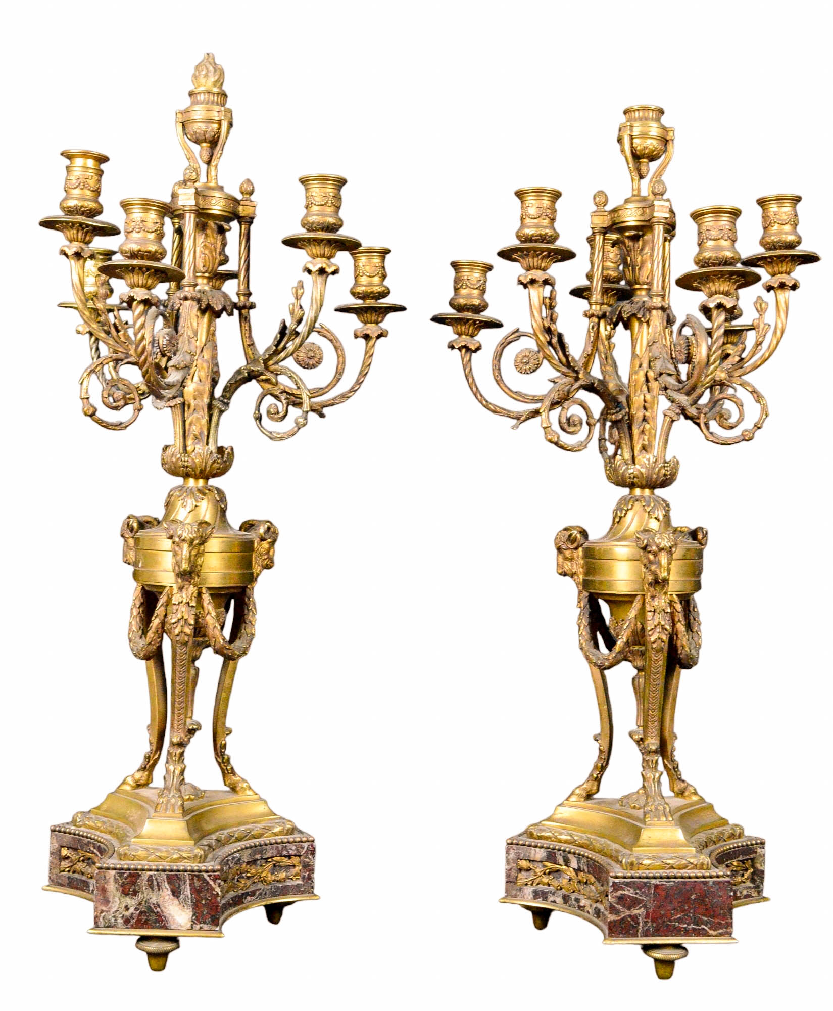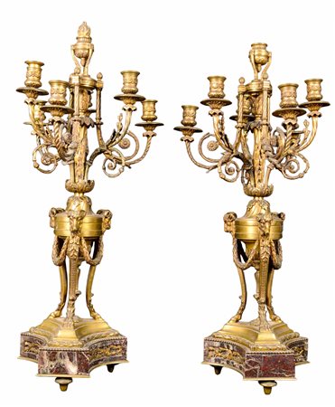 COPPIA DI CANDELIERI in bronzo dorato e finemente cesellato, a 7 fiamme, base in marmo breccia francese Francia XIX secolo h cm 78 x 32