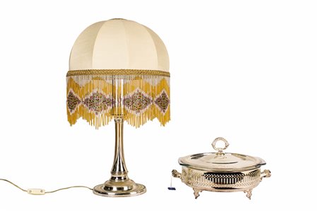 LOTTO COMPOSTO DA 1 lume in metallo argentato e 1 porta vivande in Silver plates e vetro XX secolo h cm 52 x 33 / h cm 17 x 26