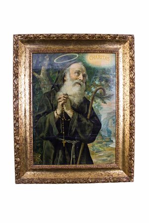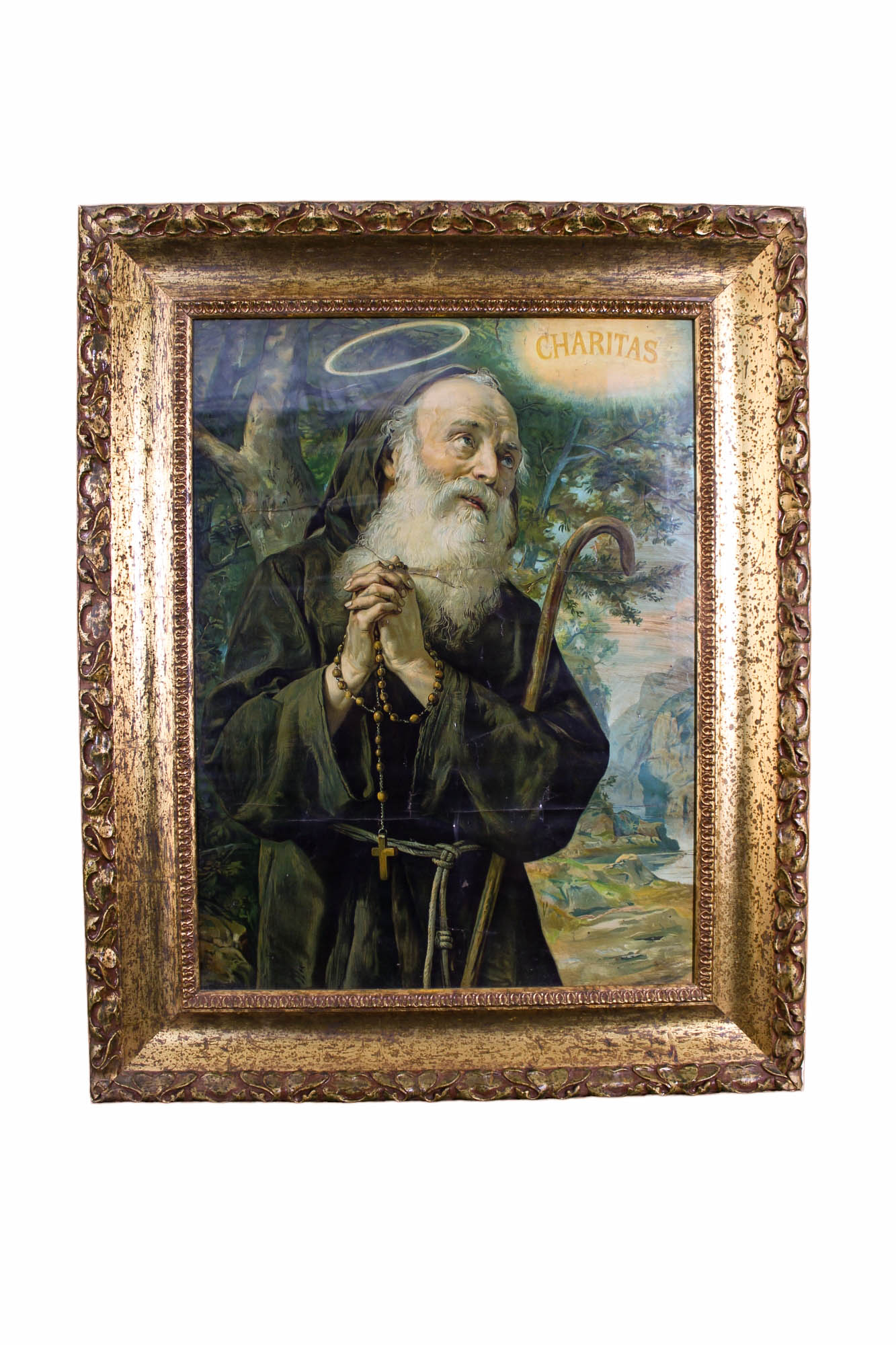STAMPA COLORATA SU CARTA raffigurante Santo dentro cornice in legno dorato XX secolo h cm 94 x 76