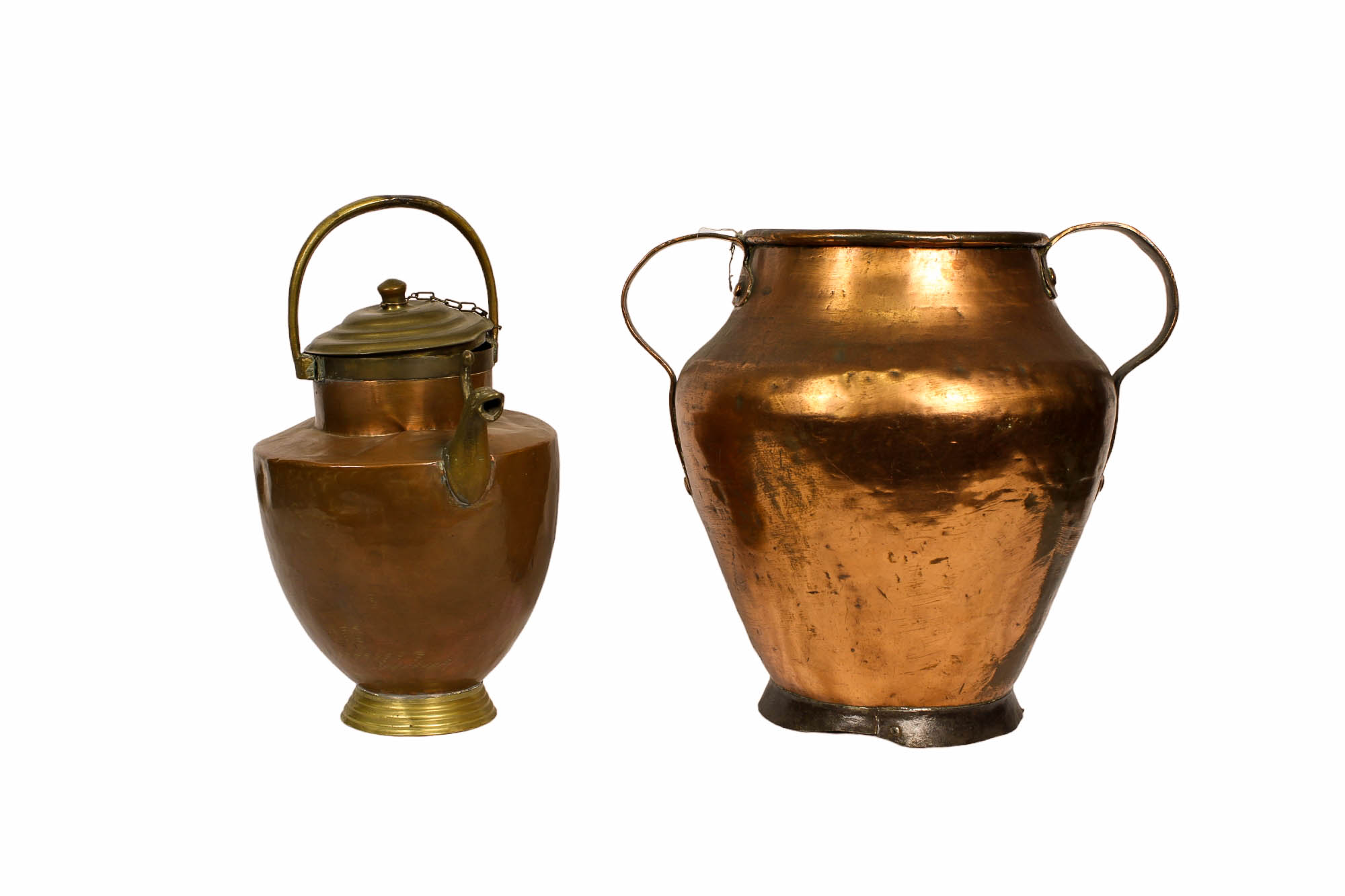 LOTTO DI 2 OGGETTI di cui un versatoio e un orcio in rame e ottone XX secolo h cm 30 / h cm 32