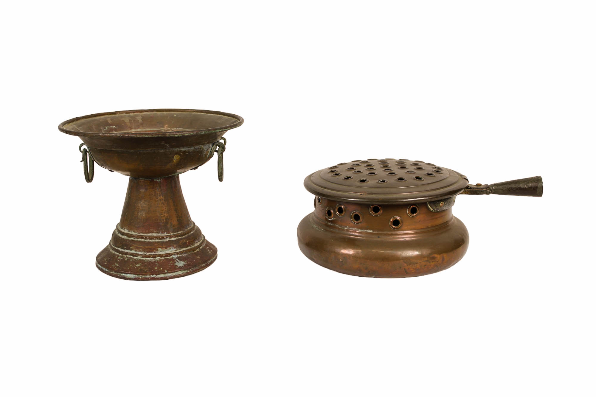 LOTTO COMPOSTO DA uno scaldaletto e un alzata in rame XX secolo h cm 20 x 24 / h cm 12 x 32 x 23