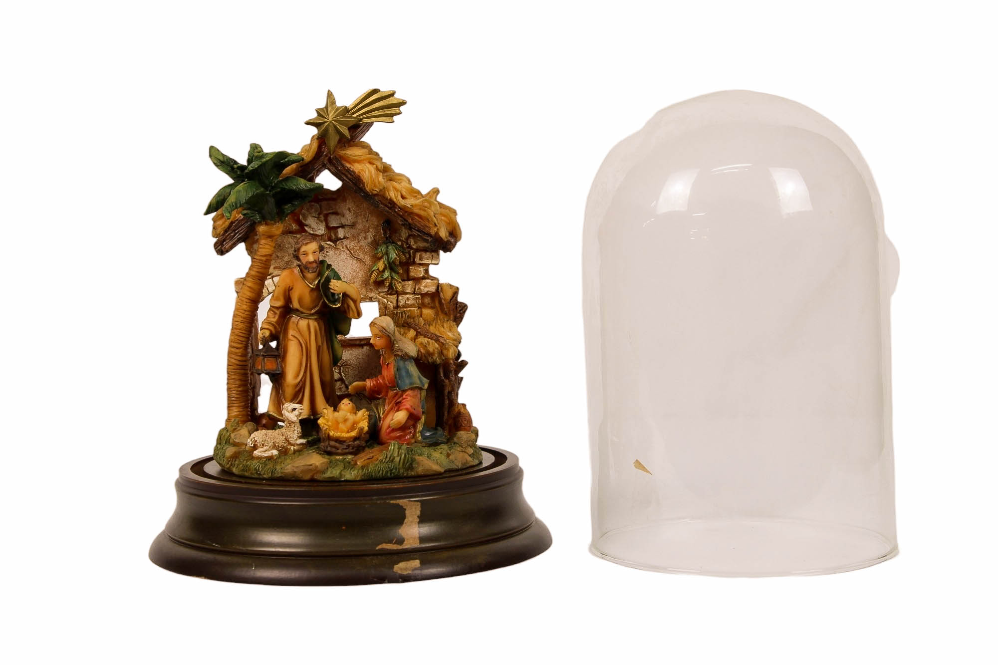 PRESEPE in materiale plastico dipinto dentro campana con base Italia XX secolo h cm 23 x 16