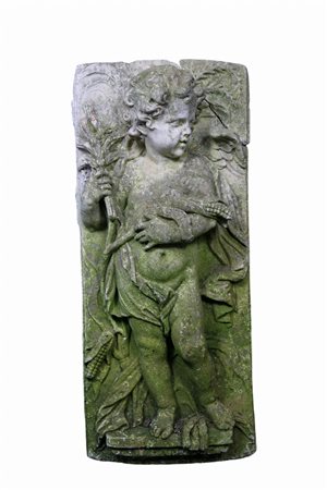 BASSORILIEVO in polvere di pietra raffigurante putto usure del tempo e incollaggi Sicilia primi 900 h cm 73 x 32