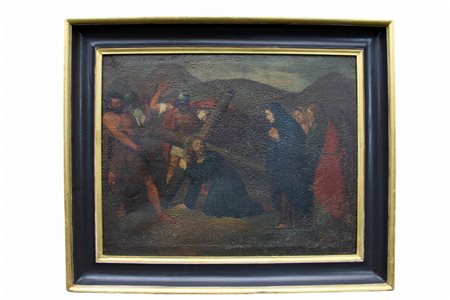 OLIO SU TELA raffigurante stazione della via crucis dentro cornice a canna ciaccata in legno laccato e dorato scuola siciliana primi XIX secolo h cm 50 x 63 / cornice h cm 65,5 x 79,5