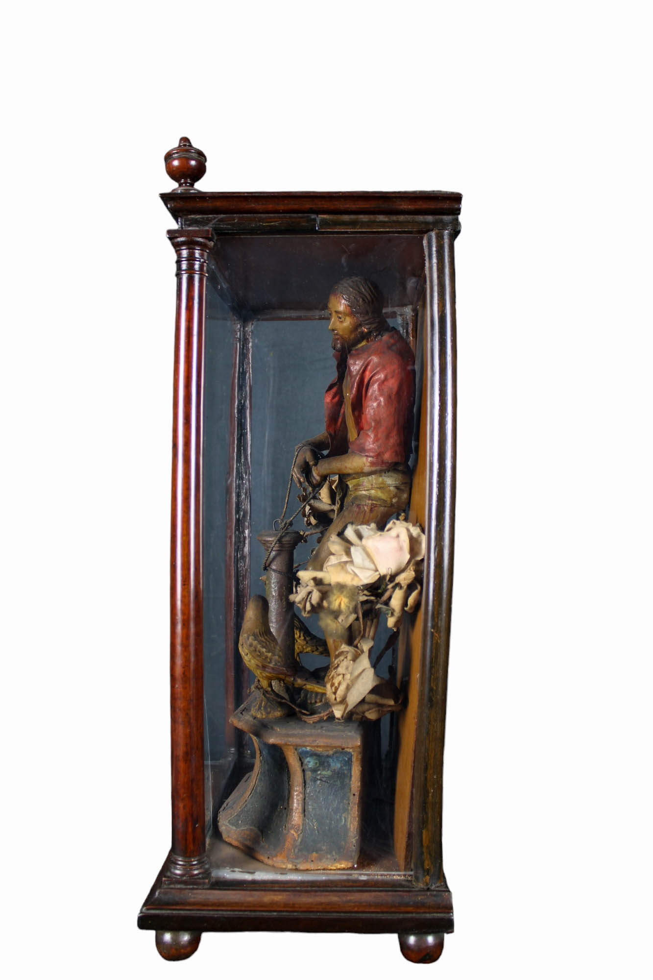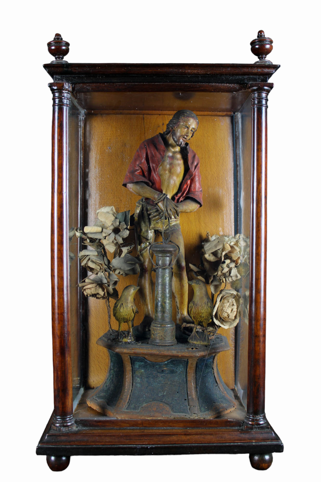 SCULTURA in legno policroma raffigurante Cristo alla colonna dentro teca in legno di noce Sicilia XVIII/XIX secolo h cm 54,5 x 30 x 20