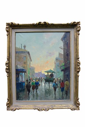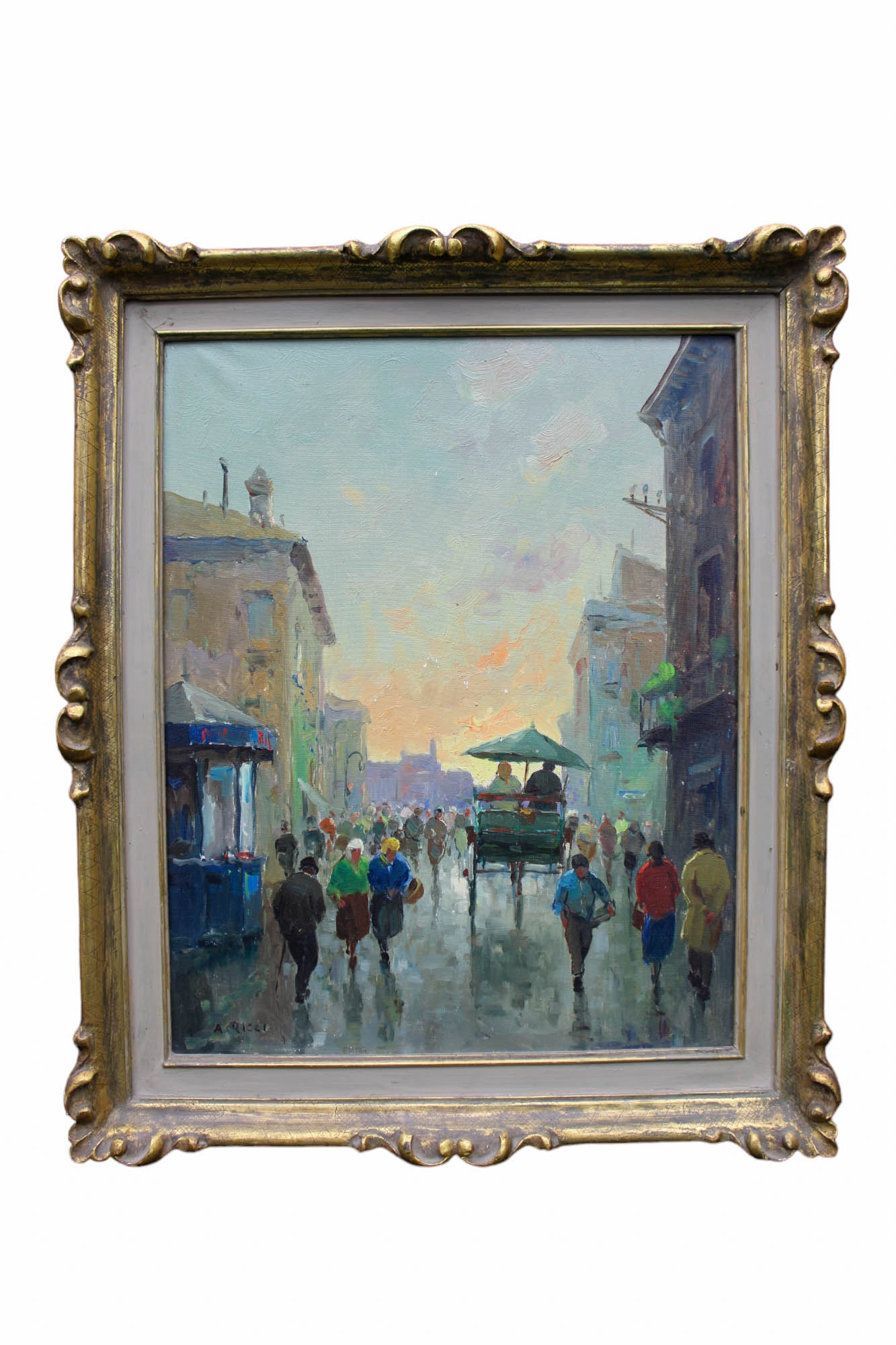 OLIO SU TELA raffigurante strada di città con personaggi firmato in basso a sx A.Ricci, dentro cornice in legno dorata Italia primi 900' h cm 48 x 39 / cornice h cm 61 x 51