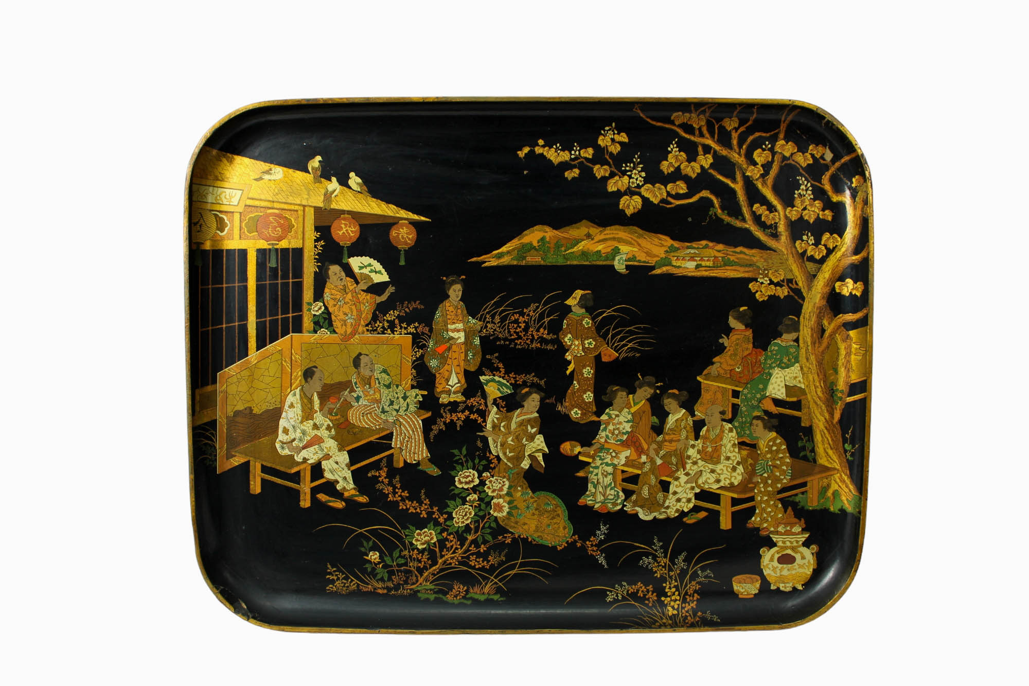 GRANDE VASSOIO in lacca dipinta e lumeggiature in oro raffigurante scene di vita, usure del tempo manifattura Orientale XIX secolo h cm 55,5 x 71