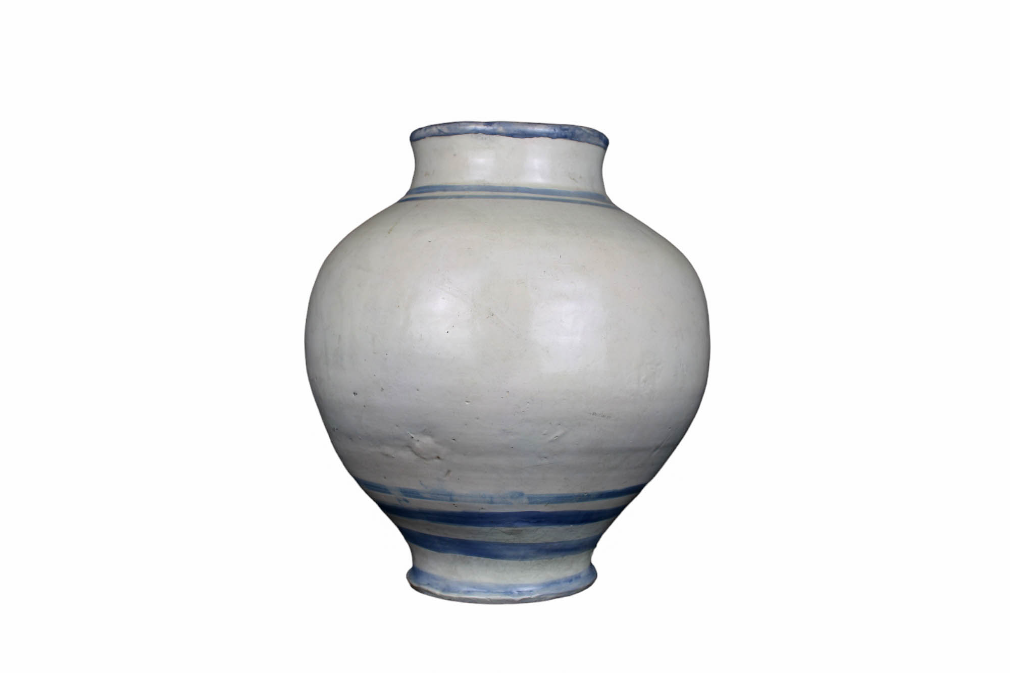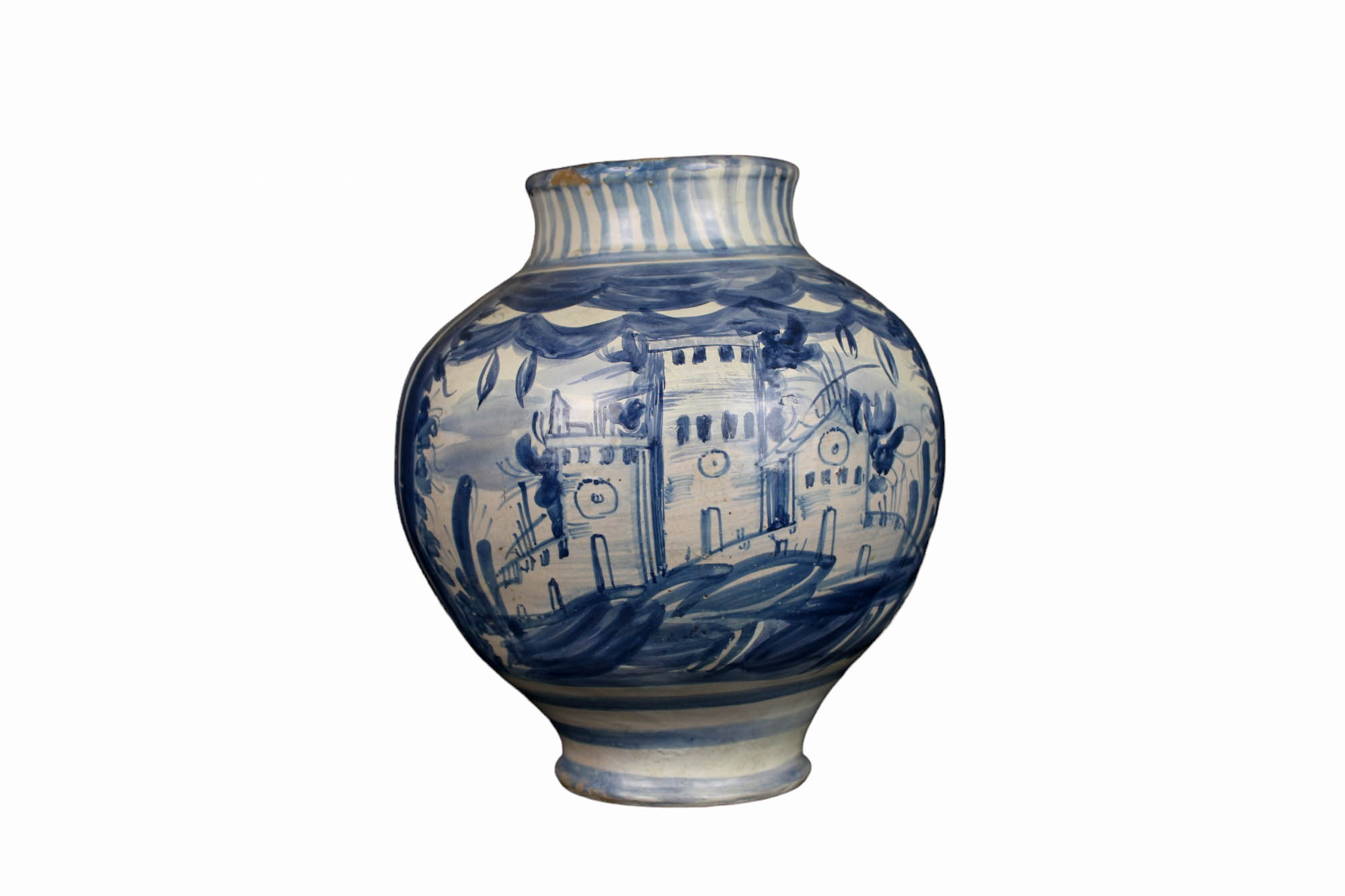BOCCIA in maiolica a fondo bianco e dipinta raffigurante scorcio cittadino nel tono del blu, vecchio restauro manifattura Napoli fine XVIII secolo h cm 25 x 22