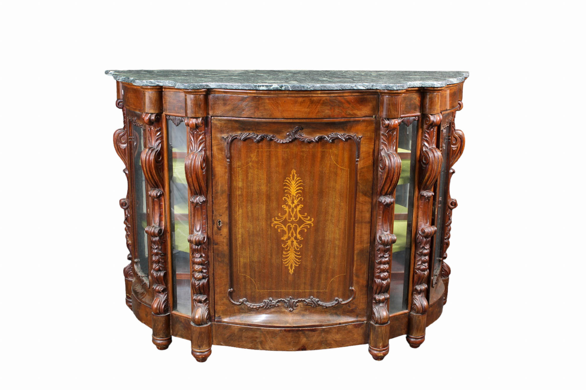 ETAGERE CARLO X in mogano riccamente scolpito con tarsie in bosso piano in marmo verde delle alpi Sicilia XIX secolo h cm 11 x 155 x 59