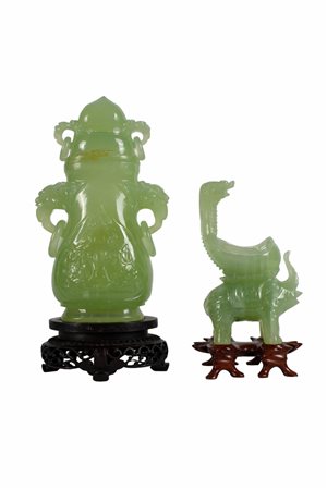 LOTTO COMPOSTO DA 1 vaso con coperchio e 1 scultura raffigurante elefante in giada verde manifattura Orientale XX secolo h cm 23,5 x 11,5 x 7 / h cm 16 x 8 x 5