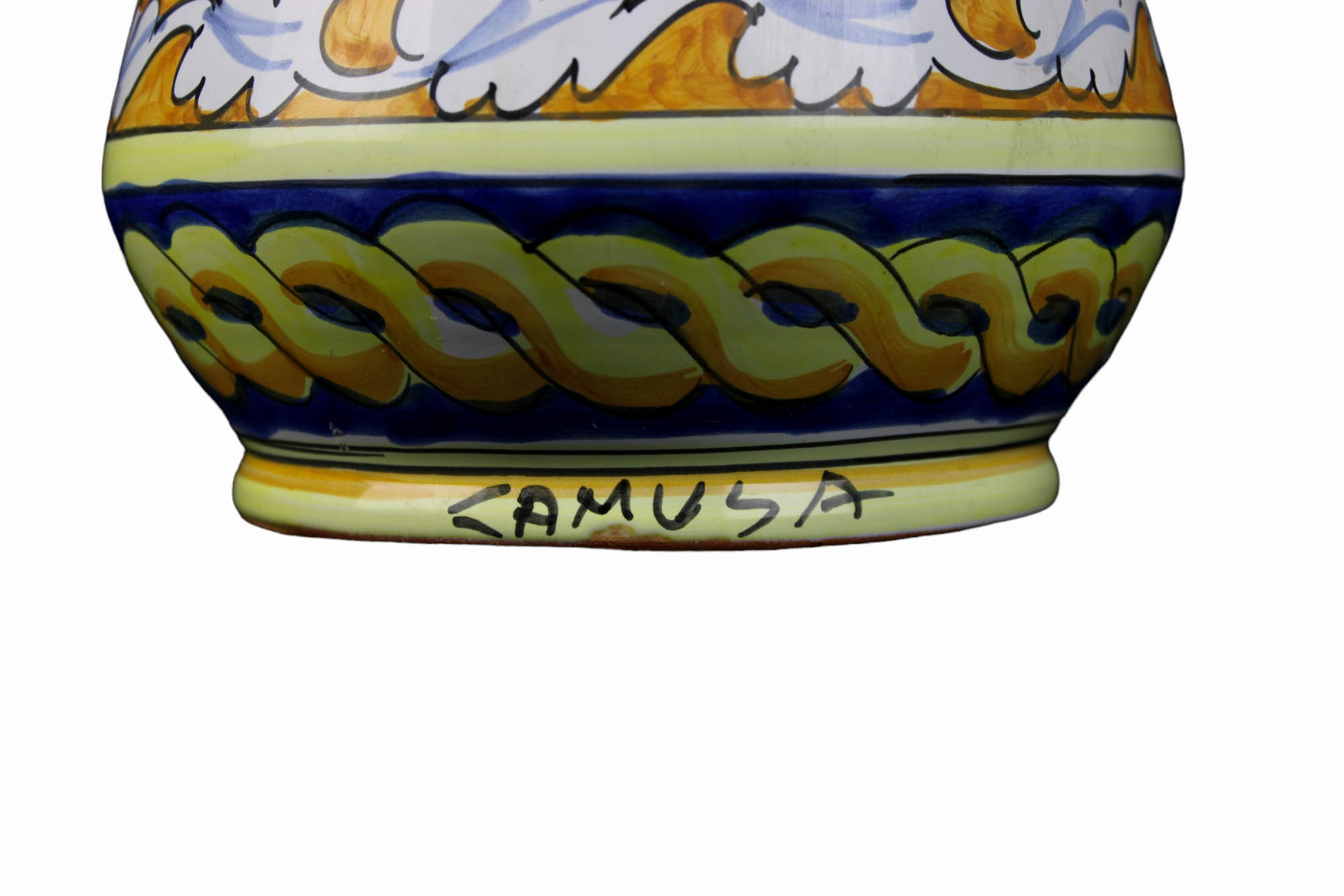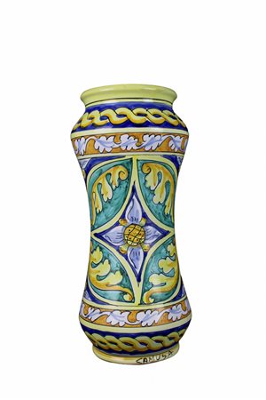 GRANDE ALBARELLO in maiolica policroma decorato a motivi geometrici e greche manifattura Italiana XX secolo h cm 39 x 17