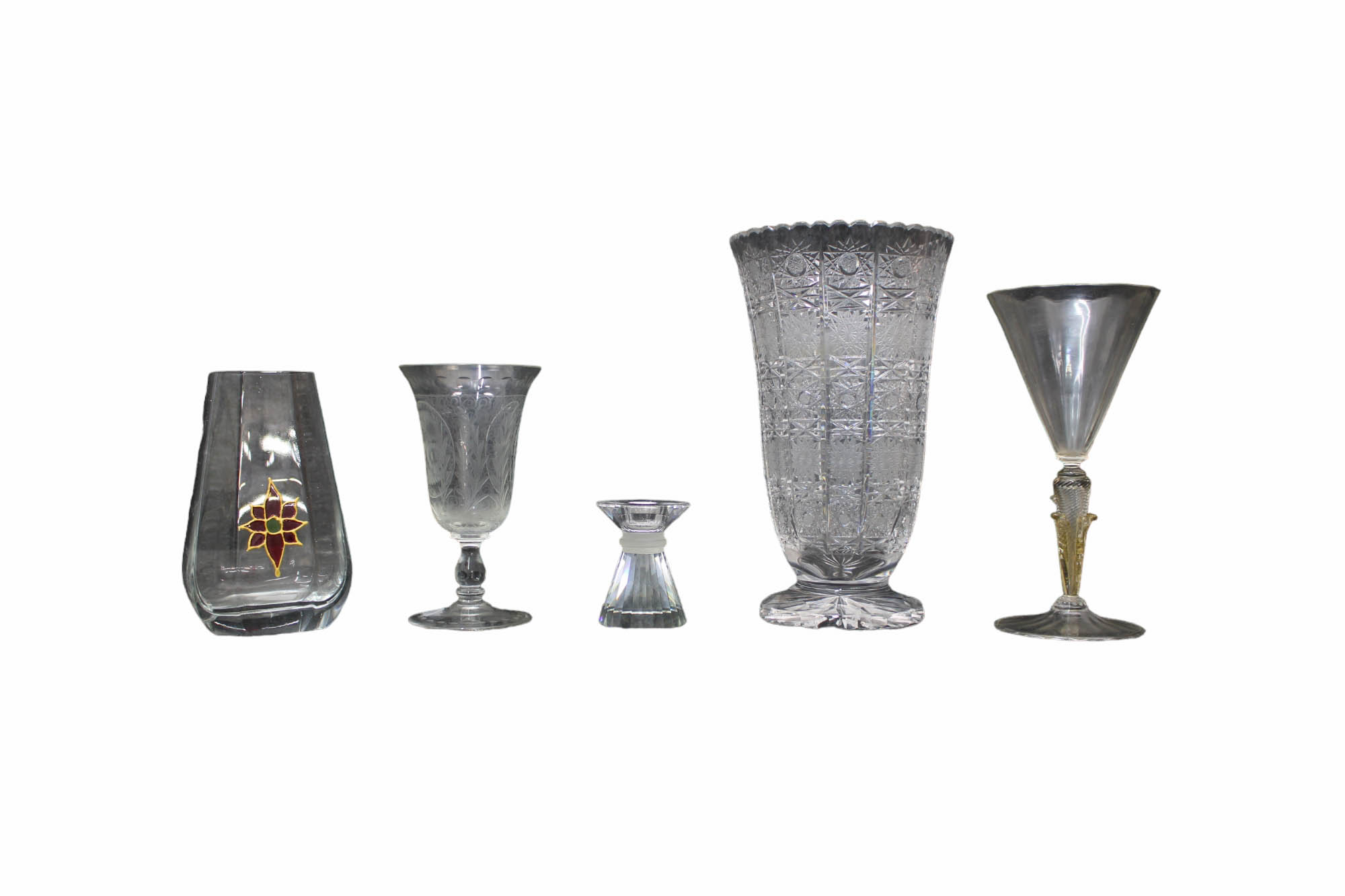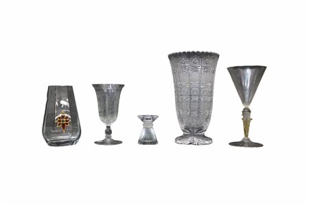 LOTTO COMPOSTO DA 2 calici, 2 vasi e 1 porta candela in vetro di diversa manifattura XX secolo misure varie