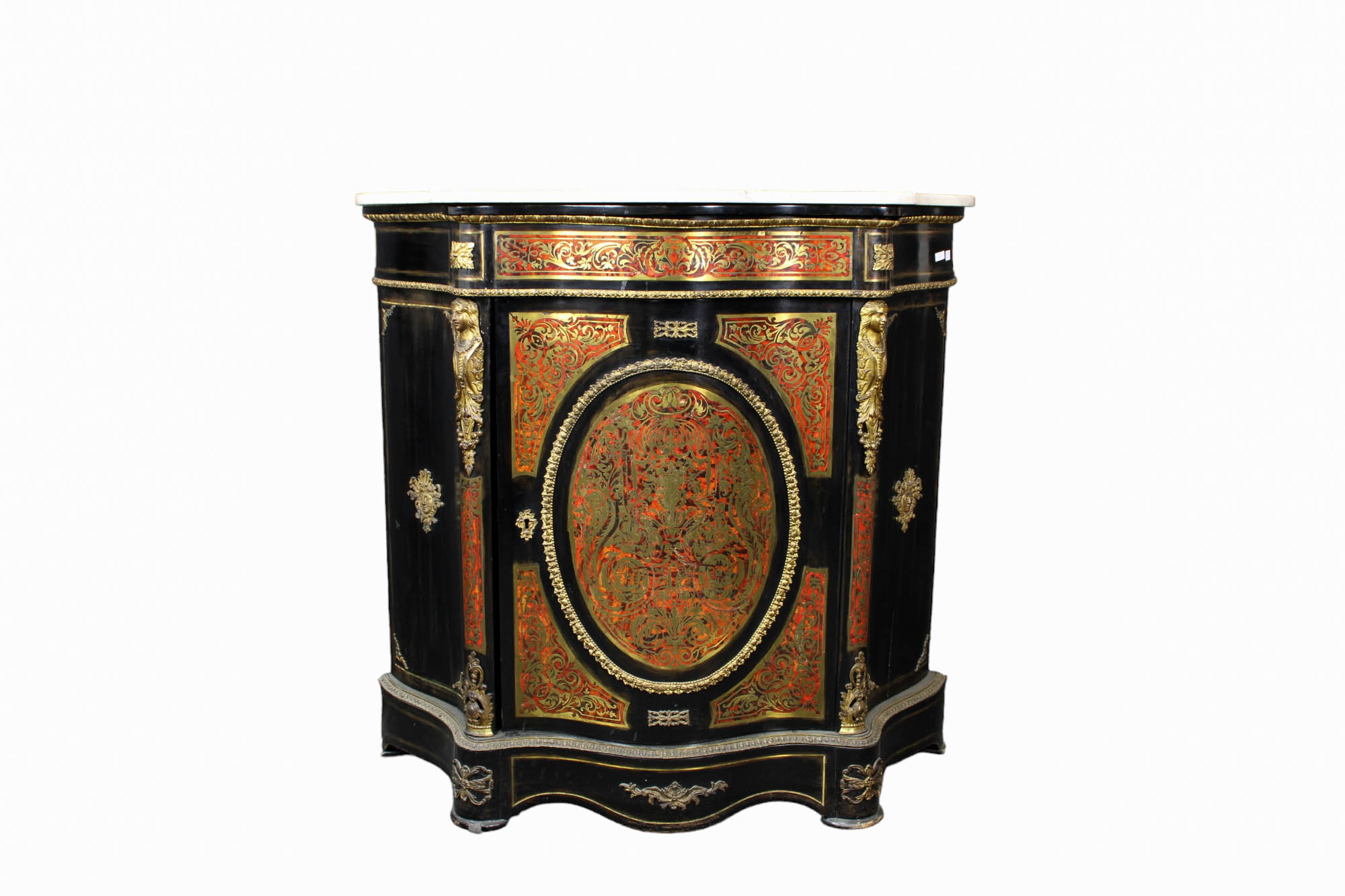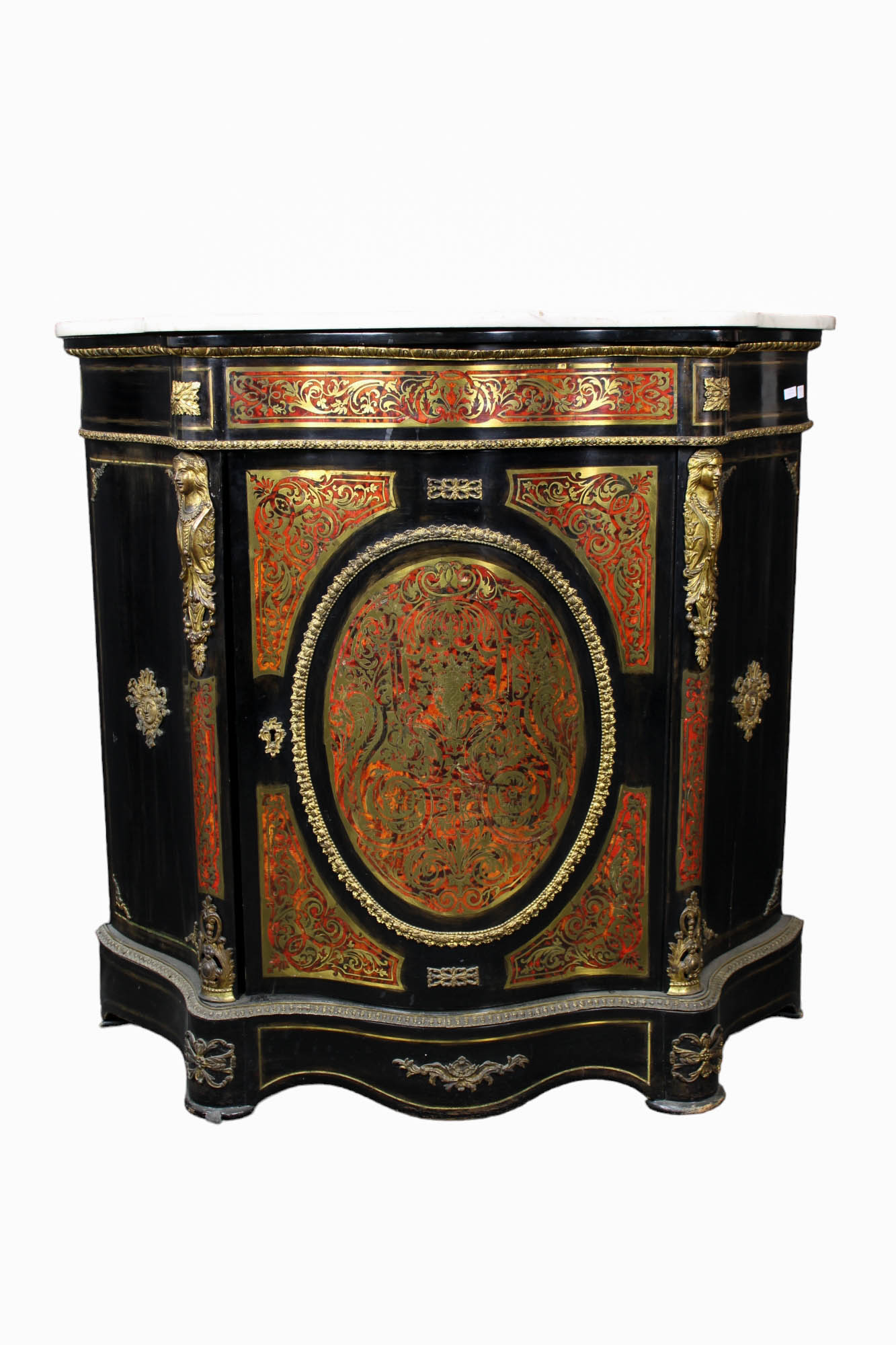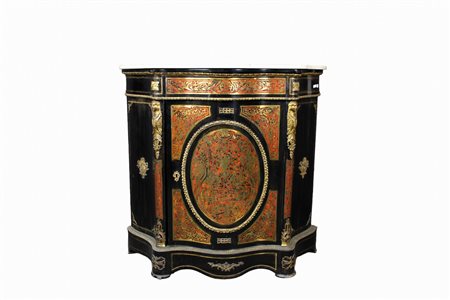 CREDENZA BOULLE AD 1 ANTA riccamente intarsiata in ottone e materiale pregiato con applicazioni in bronzo piano in marmo bianco di Carrara Francia XIX secolo h cm 107 x 114 x 42