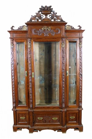 VETRINA LIBERTY in legno di pinopece scolpita a motivi floreali con lumeggiature in oro Sicilia primi fine 800 primi 900 h cm 254 x 145 x 48