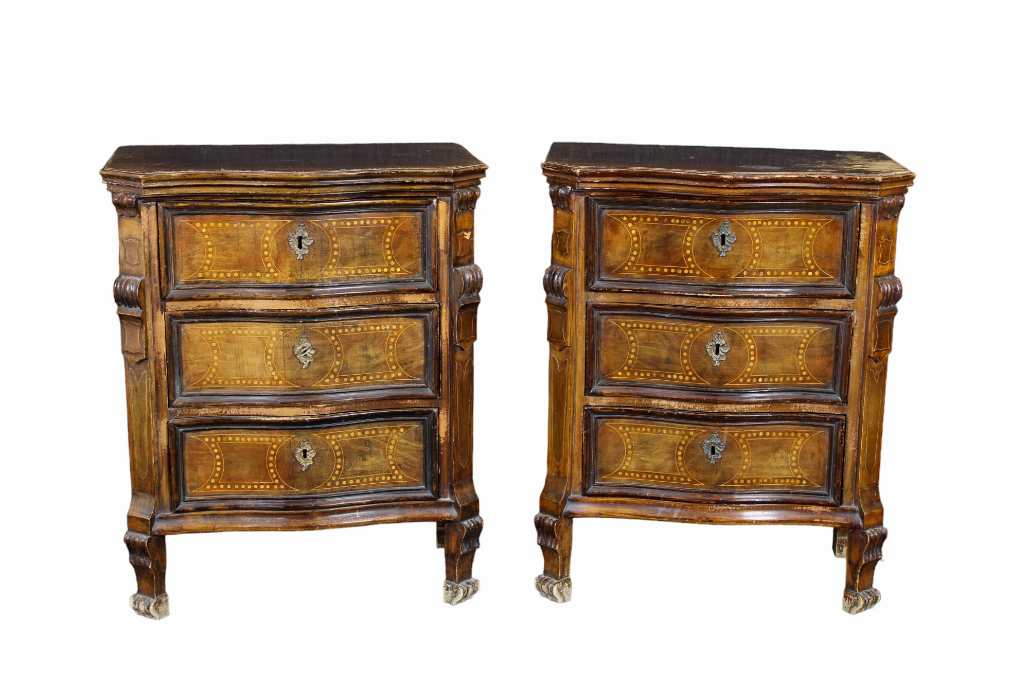 COPPIA DI COMODINI DI GUSTO SETTECENTESCO a 3 cassetti in legno di noce con tarsie in bosso Sicilia primi 900 h cm 76 x 61 x 35
