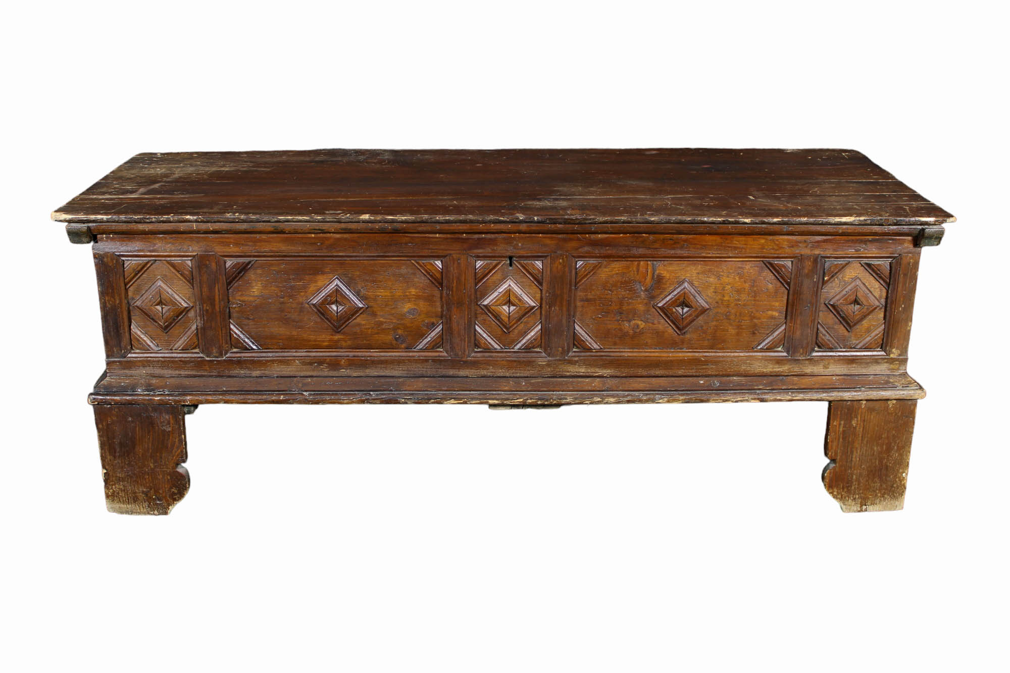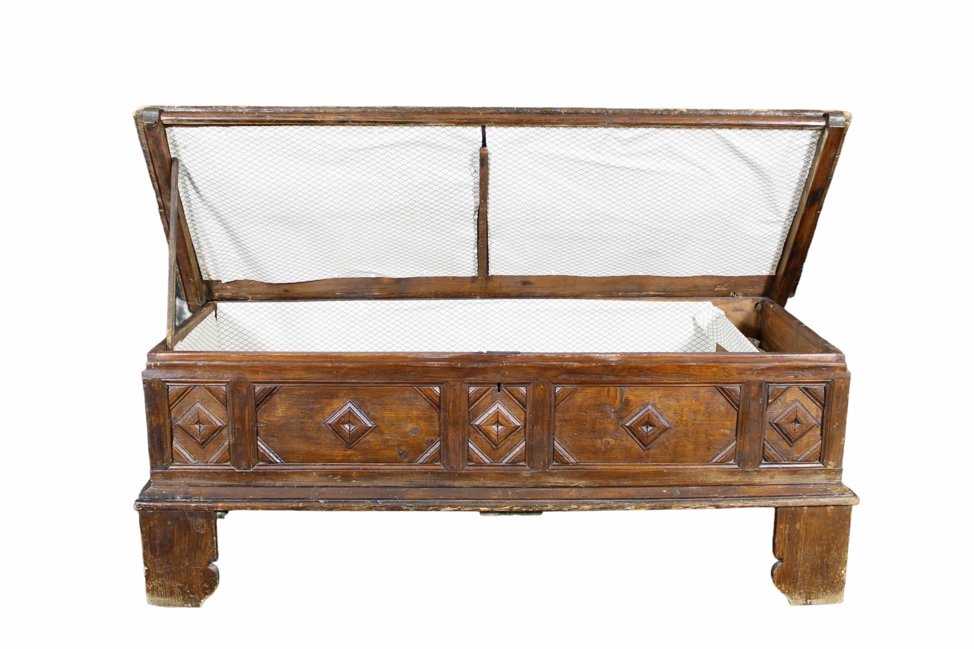 GRANDE CASSAPANCA in legno di noce intagliata sul fronte Sicilia XIX secolo h cm 67 x 183 x 70