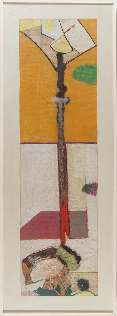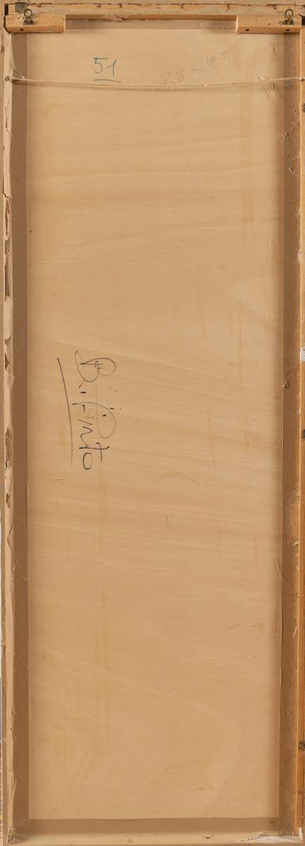 Bruno Pinto (Roma 1935 – Sasso Marconi 2018), “Senza titolo”, 1977. Tecnica mista su cartoncino applicato su tela, firmato e datato in basso a sinistra, reca al retro firma, H cm 156x55